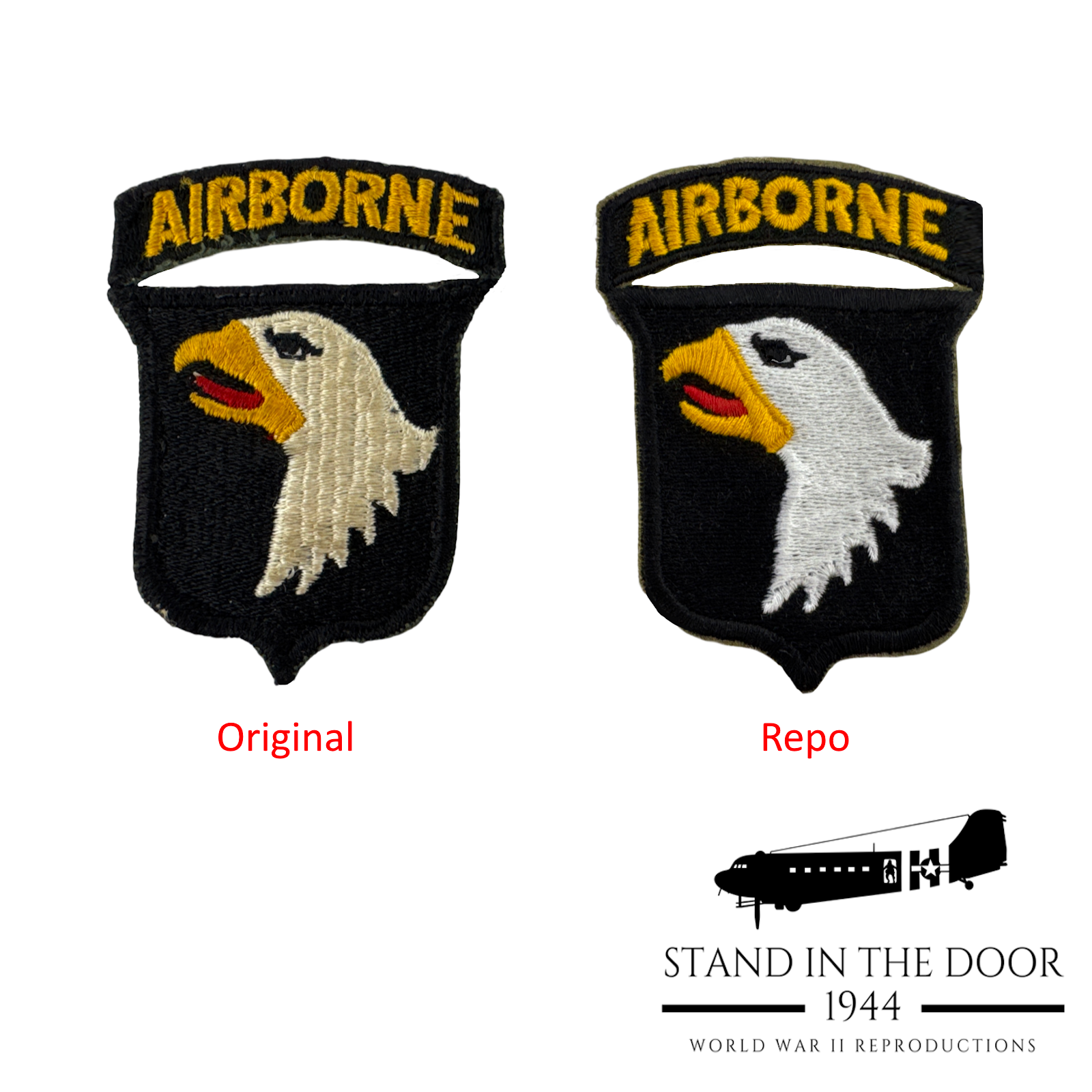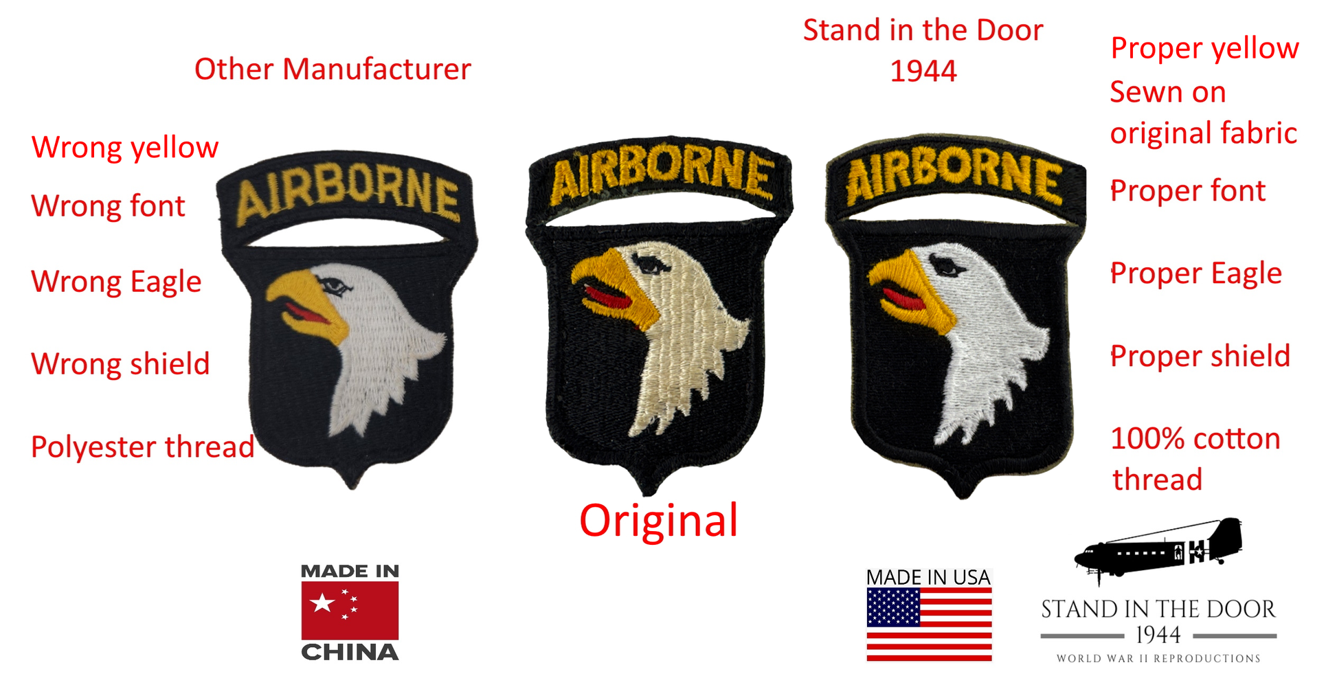 As you can see, modern day reproductions of the 101st Airborne patch look nothing like an original. The shape of the whole path is incorrect, the eagles look more like chickens, they are the wrong colors, they are made out of synthetic thread, AND THEY ARE NOT MADE IN THE UNITED STATES.