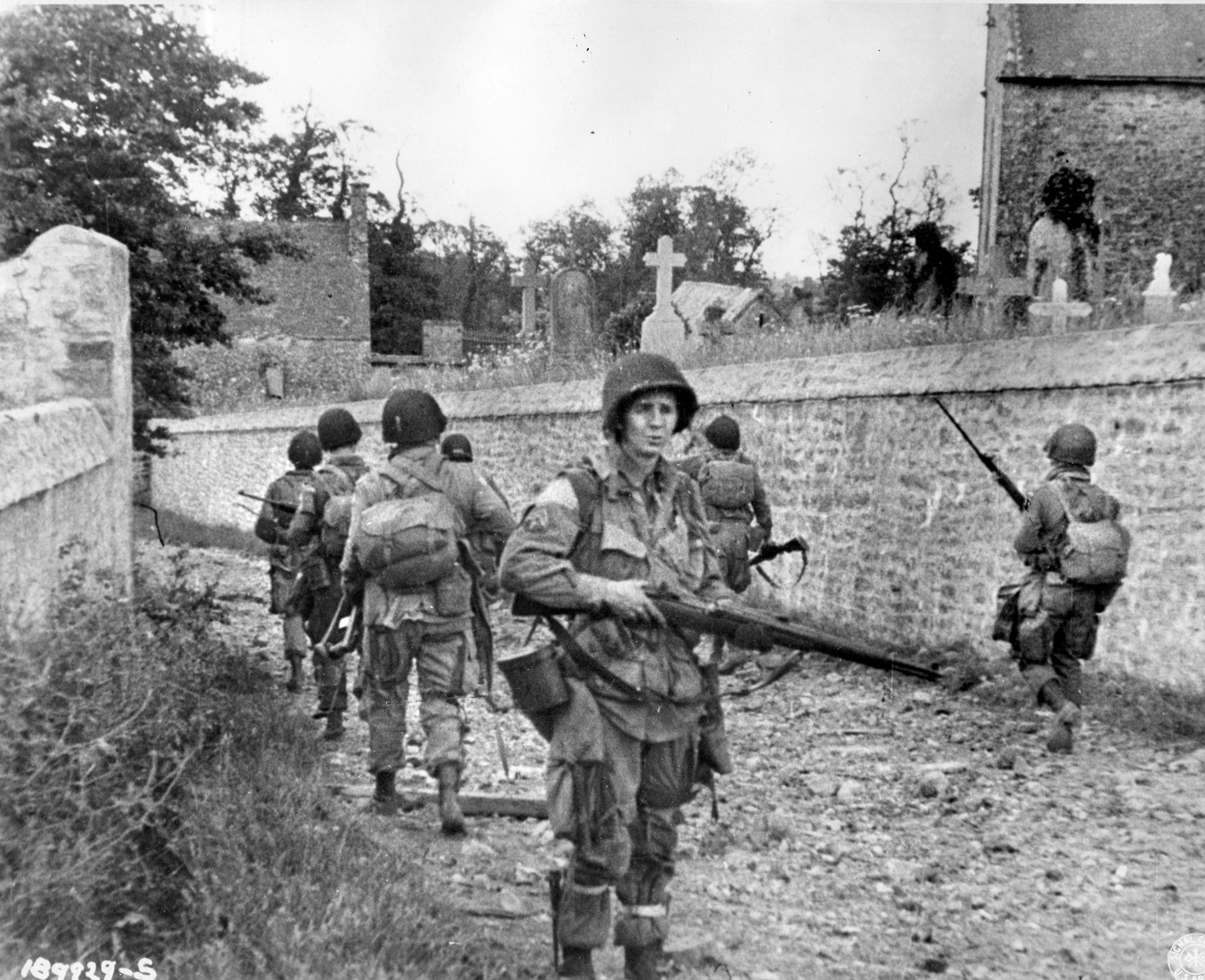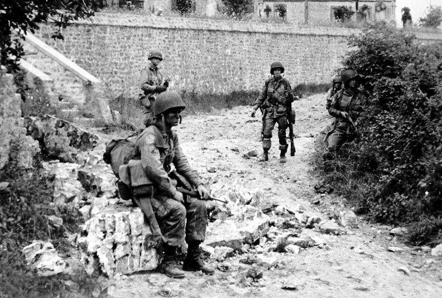 One of the fastest ways to positively identify 82nd trooper in pictures from Normandy and Holland is by looking for the American flags on their right sleeves. These flags are very apparent in photos of 82nd troopers in Normandy because the 82nd did not cover them with the gas detection brassards so widely used by the 101st.