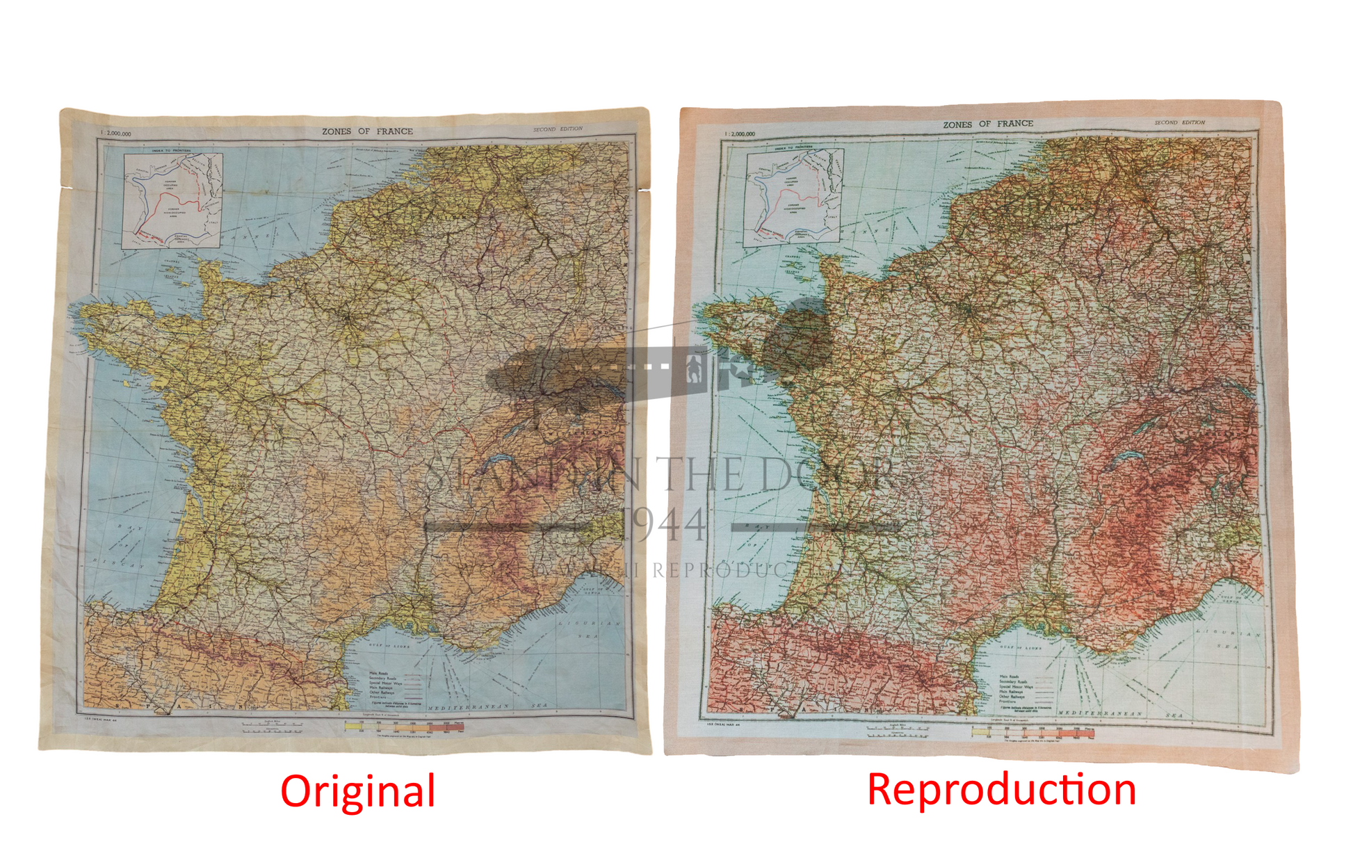 We have worked for more than 3 years to create one (if not thee) best reproduction ever made of this highly sought after cloth map. Created using an original map that was jumped into Normandy on D-Day, it holds the characteristics of the original map including the size, color, shape, and feel. Printed on a cotton/silk blend fabric, it perfectly matches the weight, feel, texture, and opacity of my original map (see comparison photos for reference).