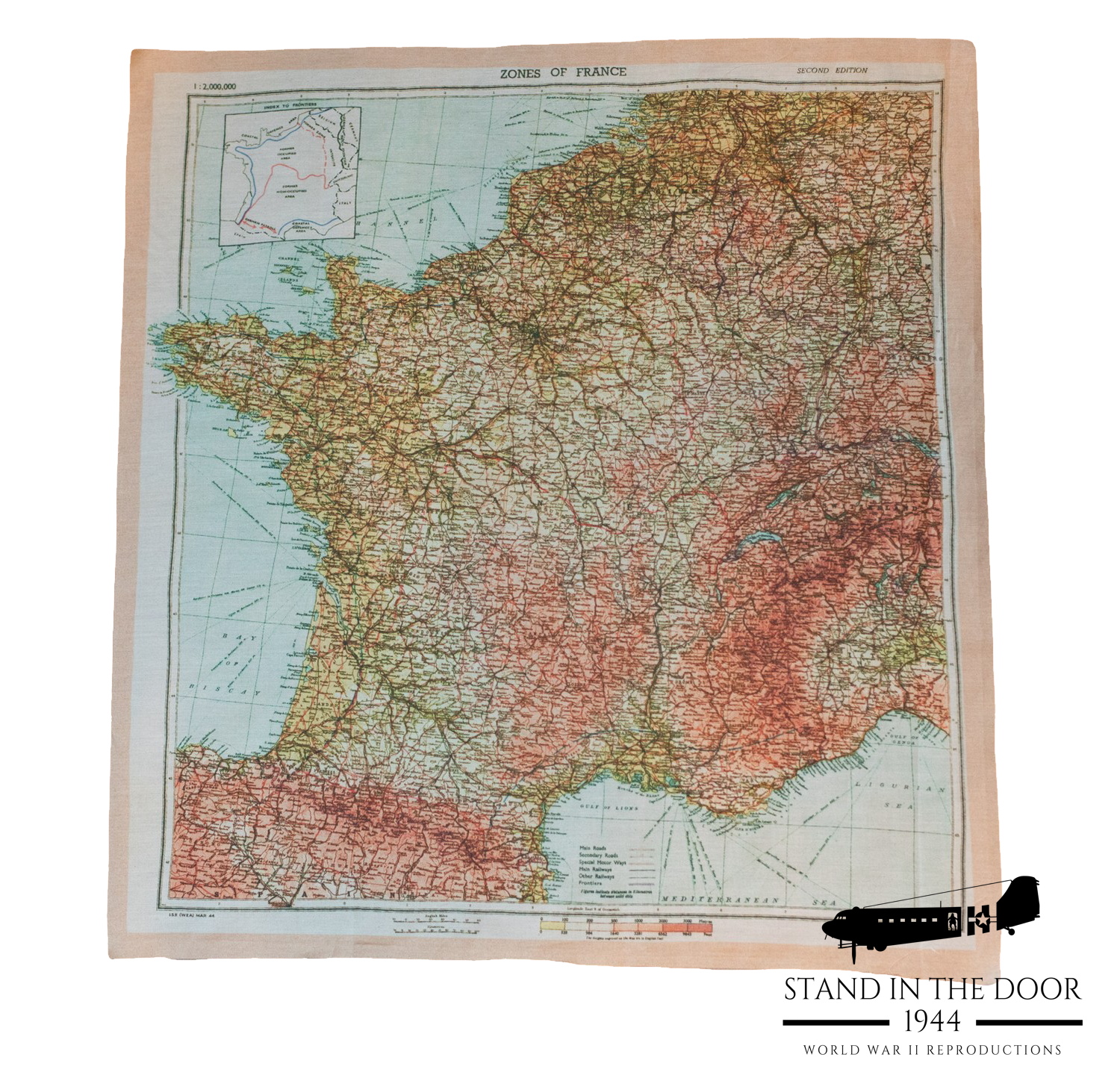 The Zones of France map was designed as an "escape map" meaning that it was printed on a rather small bit of fabric (58.5cmx60cm) which could be hidden easily on the body when captured as well as it was printed in an exceptionally large 1:2,000,000 scale. That being the case the map was not very useful for traditional military land navigation. There are no gridlines and much of the smaller print is difficult if not impossible to read even under a magnifying glass due to its large scale as well being printed on the porous surface of fabric instead of the smooth surface of paper. Rather it was used primarily to determine a person's general geographic location so they could plan a route to "neutral" counties like Switzerland and Spain and be smuggled back to England.