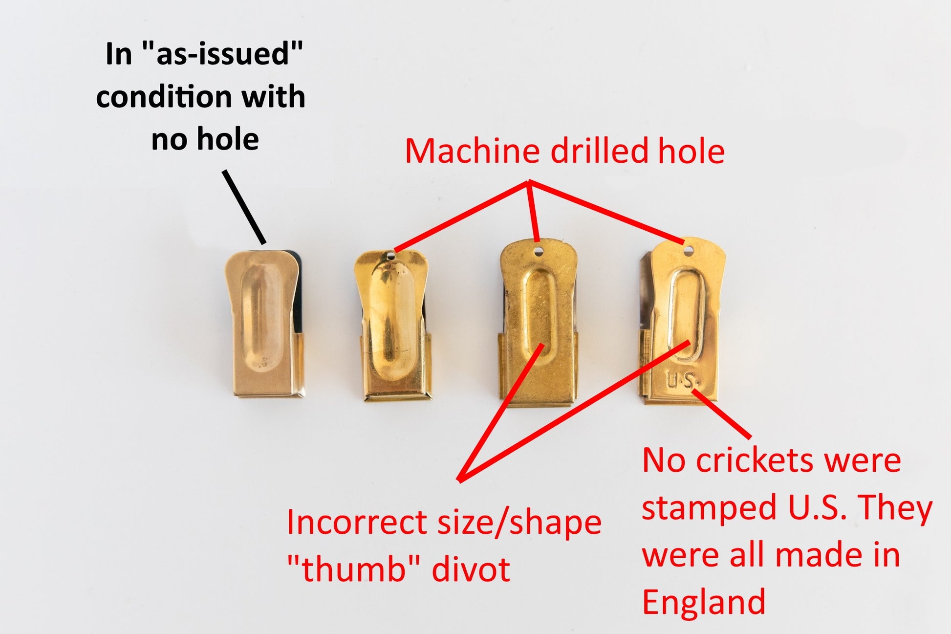 Then there was the snapping plate. Original crickets used a snapping plate that was made out of blued (gun metal blackening) so that they did not shine as much in the dark. Also the snapping divot was about the size of the head of a pencil eraser. 90% of reproduction crickets use a shined piece of steel which has a very large snapping divot that is about the size of a dime. This differing shape of the divot also makes them sound quite different than originals.