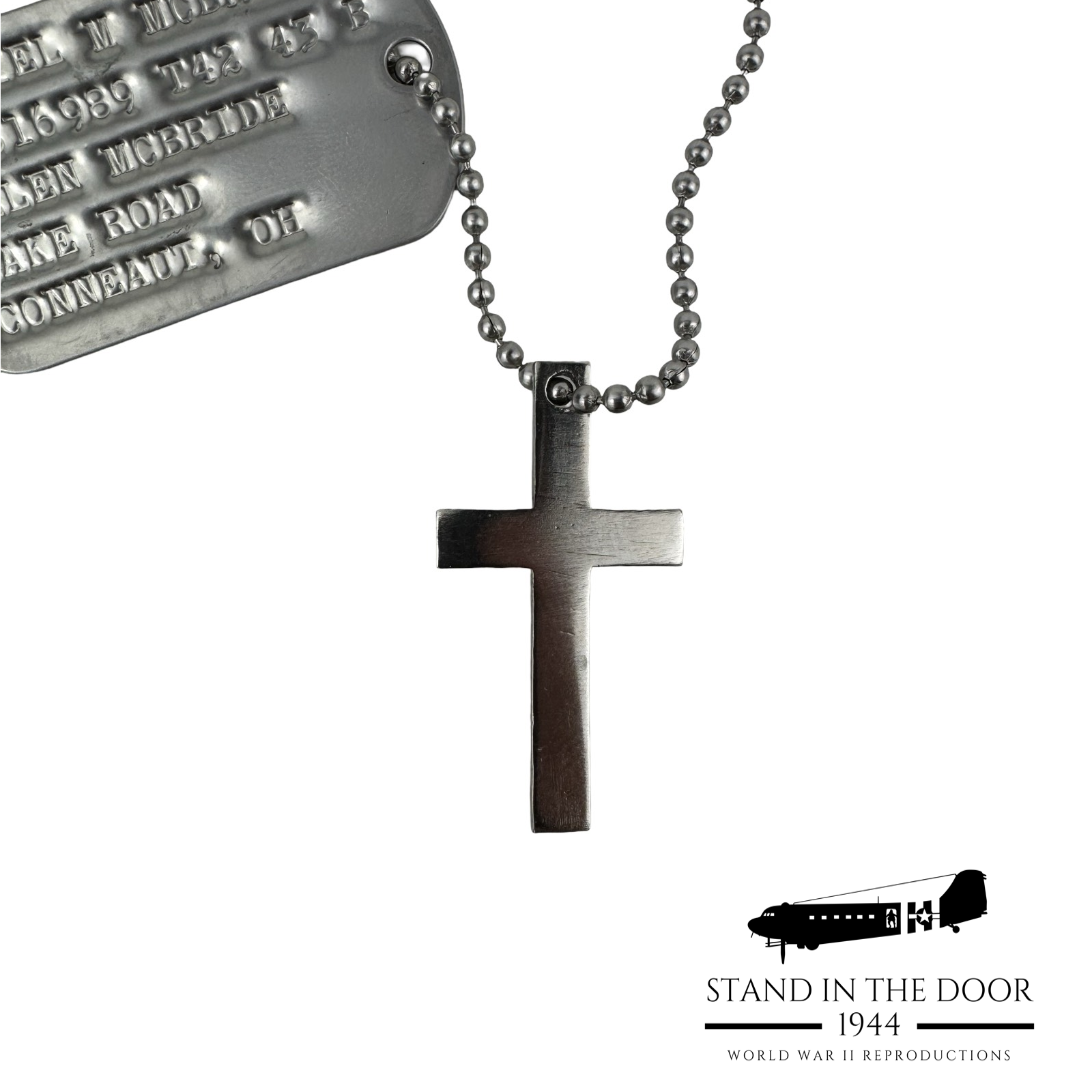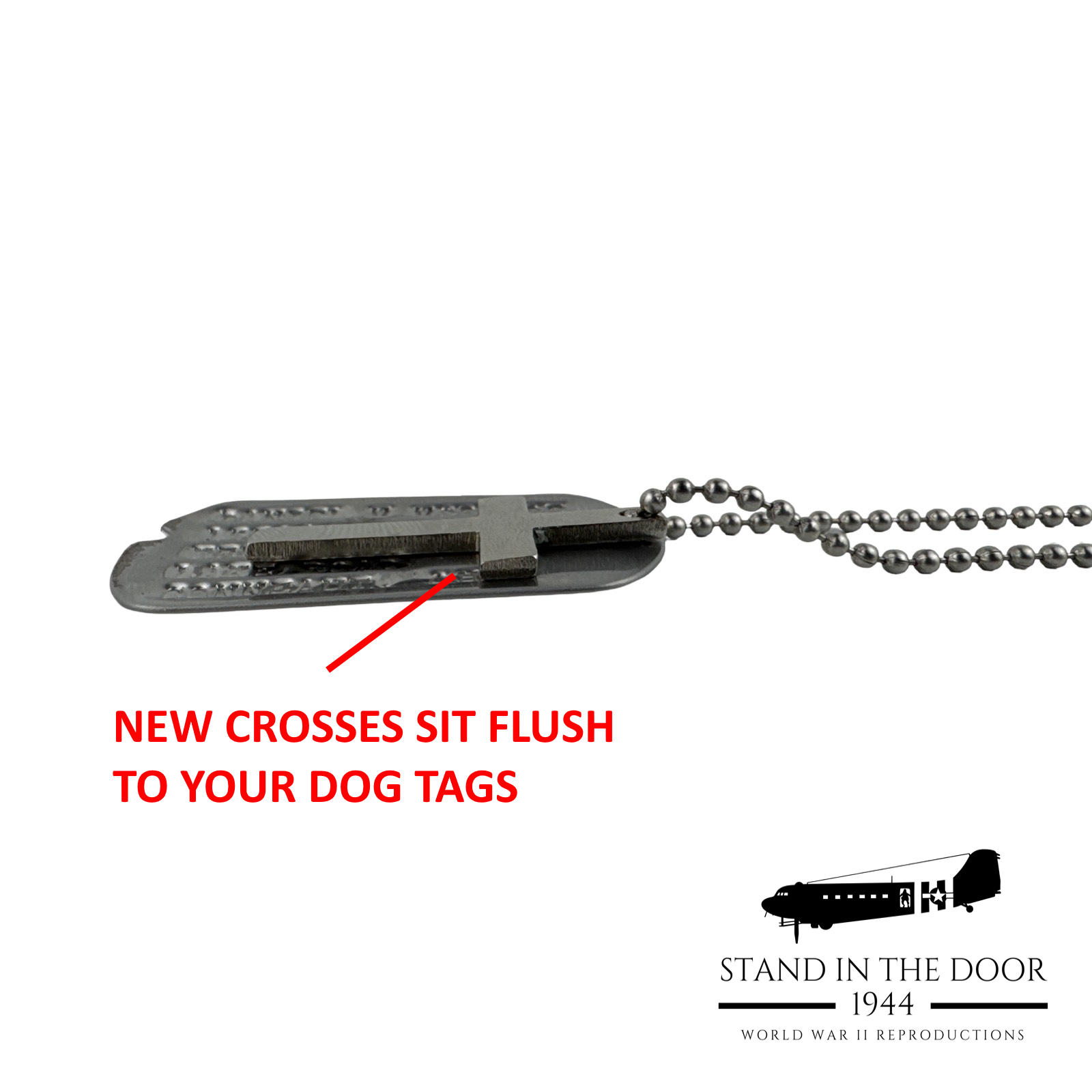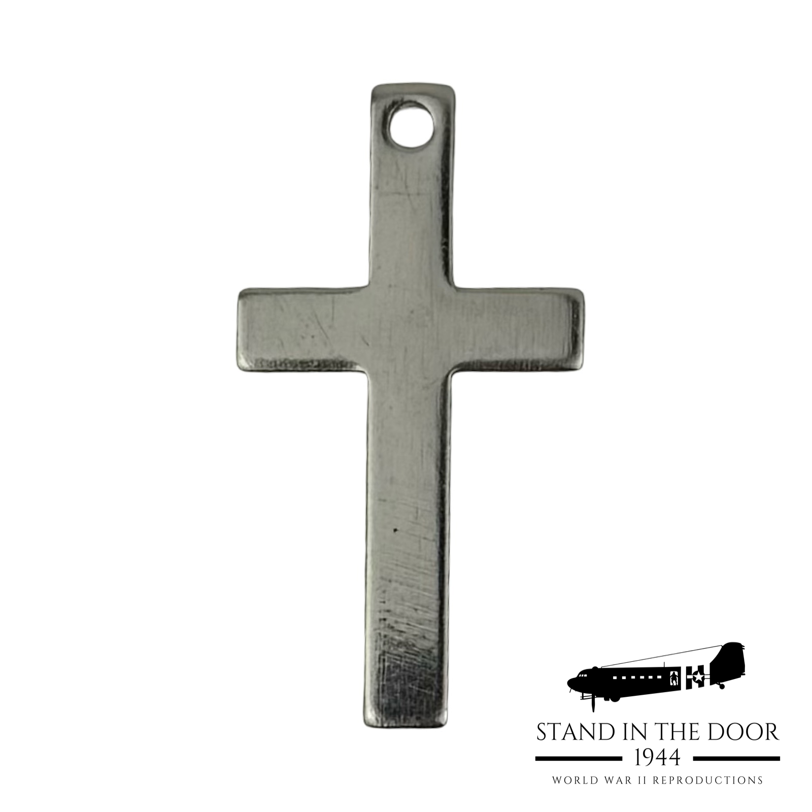 Crosses, Crucifixes', and Stars of David were commonly worn on or alongside military dog tags to give soldiers a reminder of their faith in the midst of the toughest situations life could throw at them. Faith was a cornerstone in the lives of many WWII veterans as it is for many who have served our country, the same is true for us at Stand in the Door 1944. That is why it is our pleasure to bring you these beautiful "dog tag" crosses. Cut and polished from stainless steel, these crosses were designed specifically by us to fit perfectly with USGI dog tags.