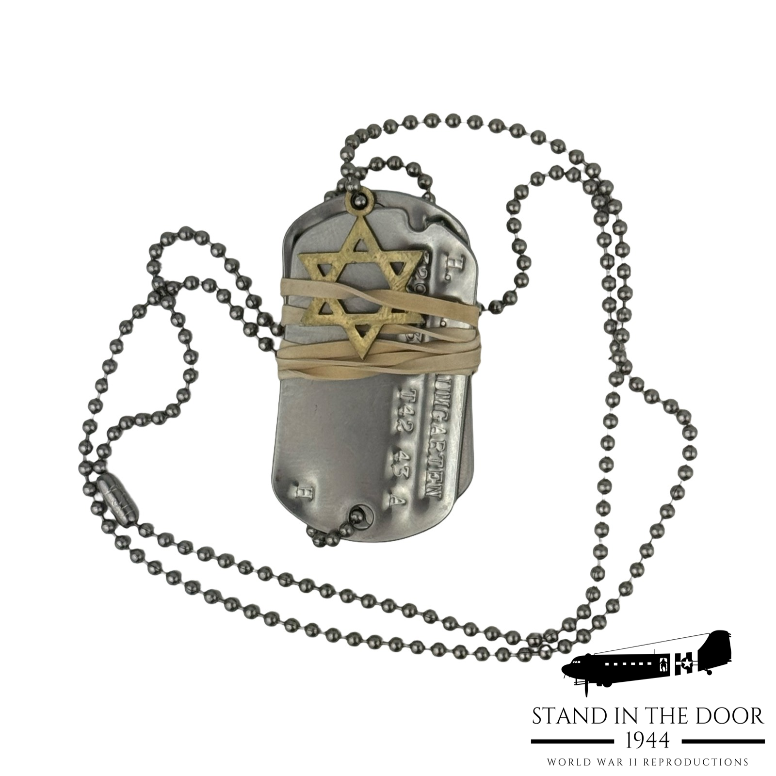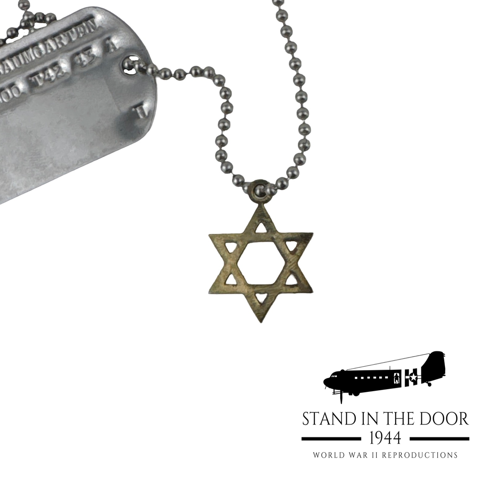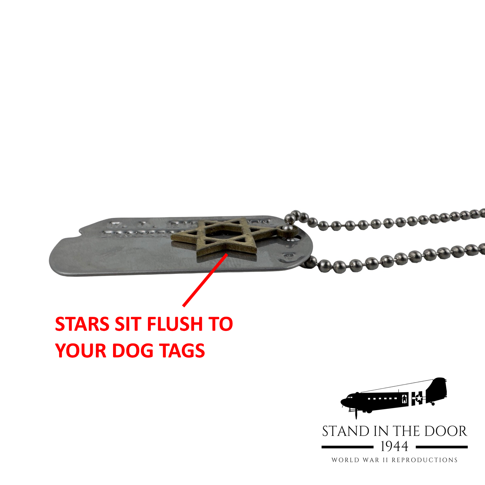 It is for those brave men and women that SID44 has designed these beautiful Star of David "dog tag" pendant. Precision cut out of stainless steel and electroplated with a "gold look." At the top of the Star is a loop specifically designed to fit the standard USGI dog tag ball chain. This integrated loop allows the Star to sit flush to the dog tag so that there are no pointed edges poking into the chest as it is being worn.
