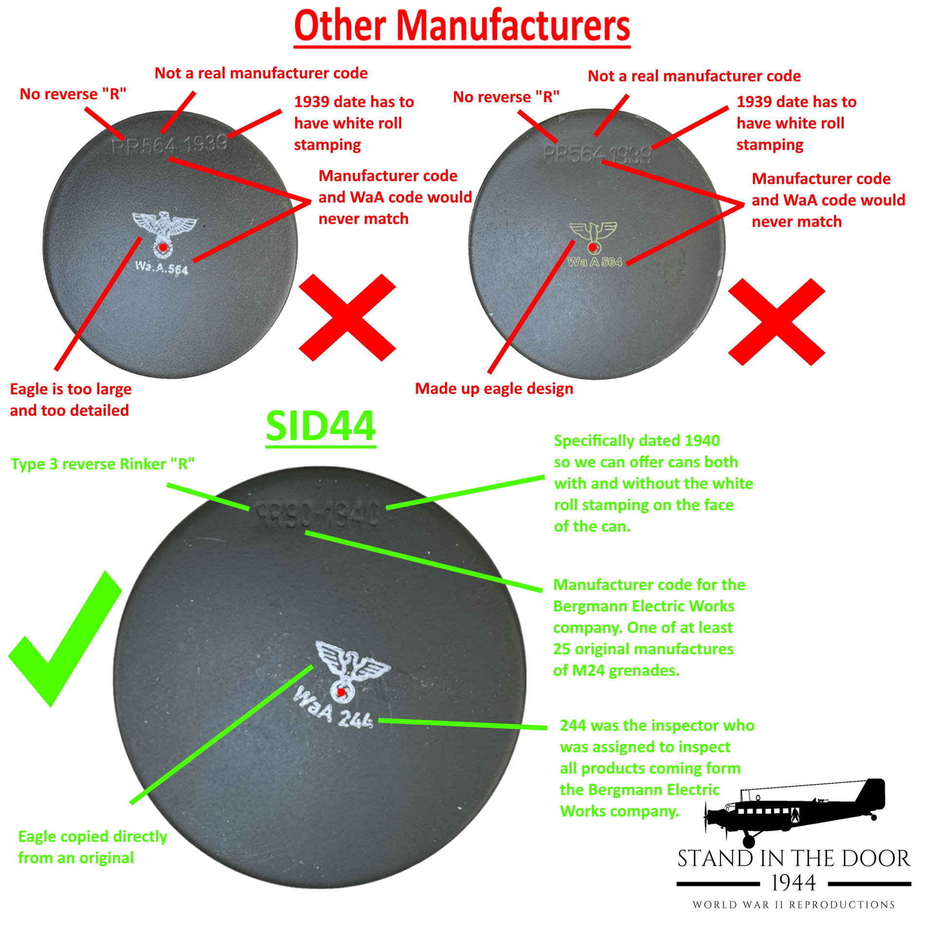 Most recognizably on our replicas we offer versions both with and without the white ink roll stamping. All M24 mashers manufactured before April of 1940 had the directions "before use insert detonator" printed on them with white ink. These directions were necessary because original mashers were not shipped with the detonators install, that had to be done in the field when they were issued to troops. In April of 1940 the German high command gave their manufactures orders to stop putting the roll stamping on M24 cans.