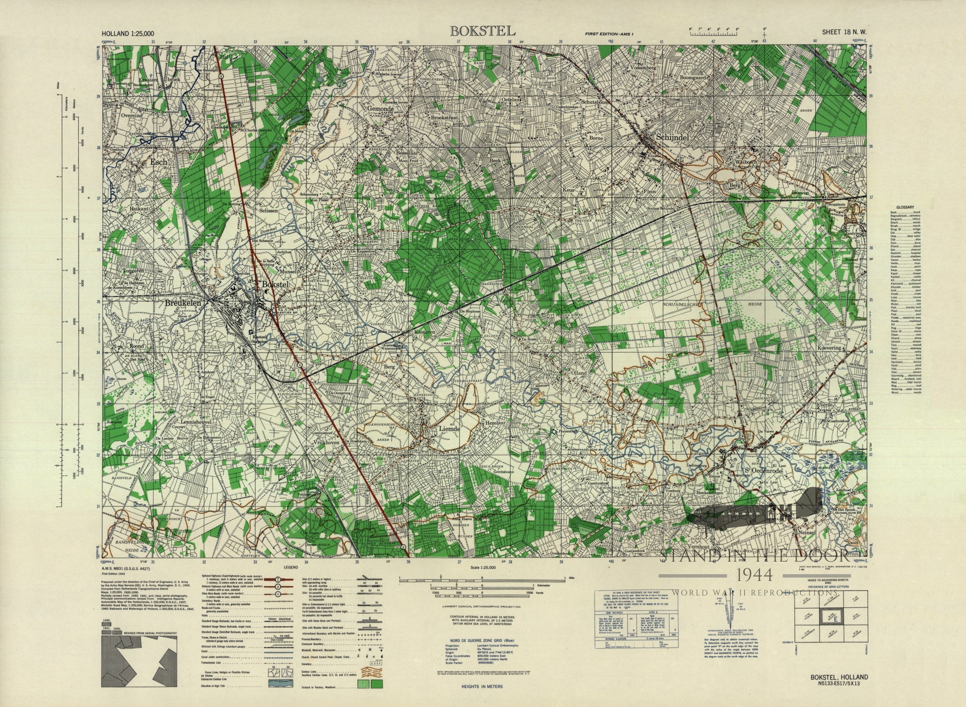 Reproduction "Bokstel" map in 1:25,000 scale. This map would have been the most common map from Division Headquarters all the way down to platoon leaders, company commanders, and senior platoon/company NCO's of the 101st Airborne Division during the opening stages of Operation Market Garden for land navigation and tactical movements.