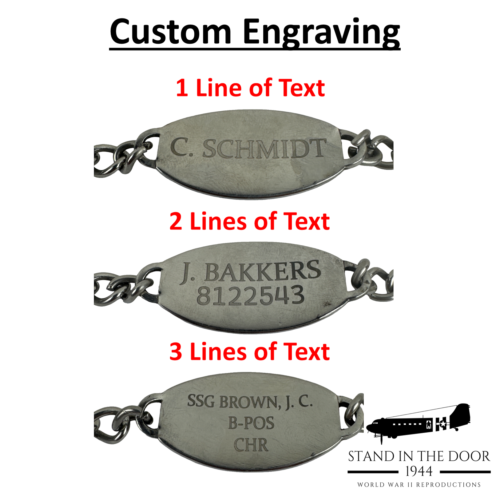 ID bracelets were a "private purchase" item for GI's so there is no "standard format" for the text on these bracelets though there are a few formats that were more common. Common engraving formats seen on original ID bracelets: