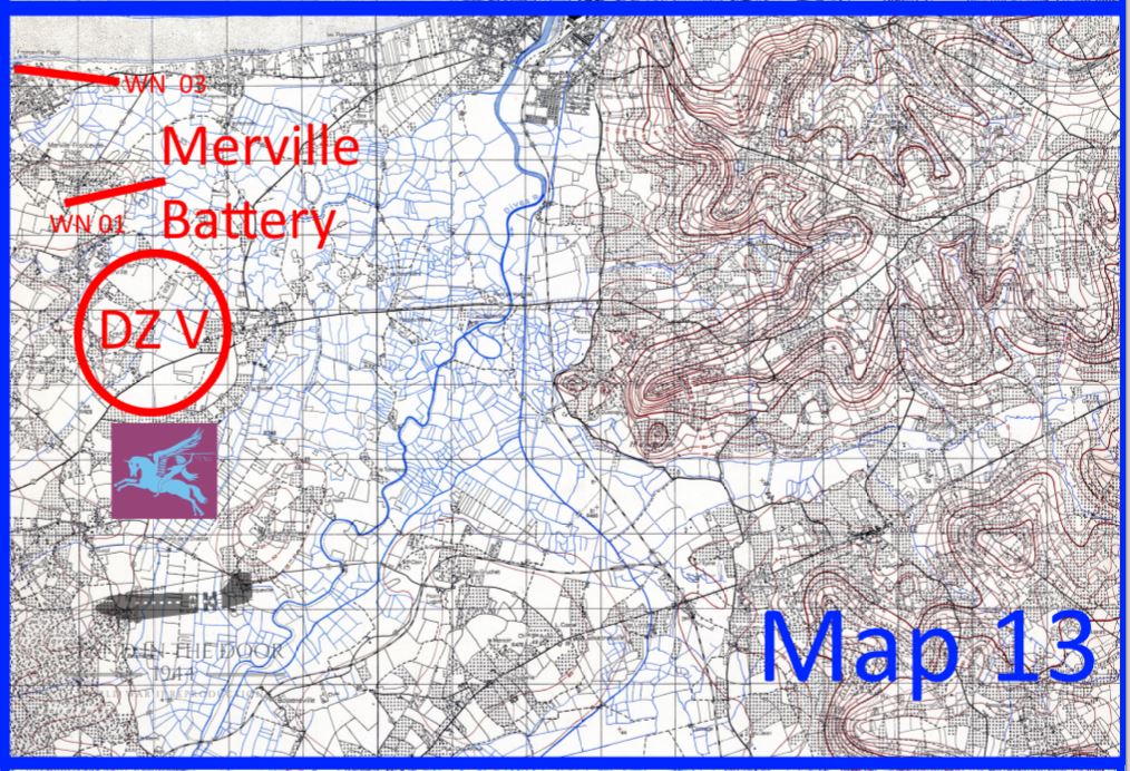 This map primarily shows the city of Dozule as well as the surrounding areas North and west including Drop Zone V and the Merville Battery.