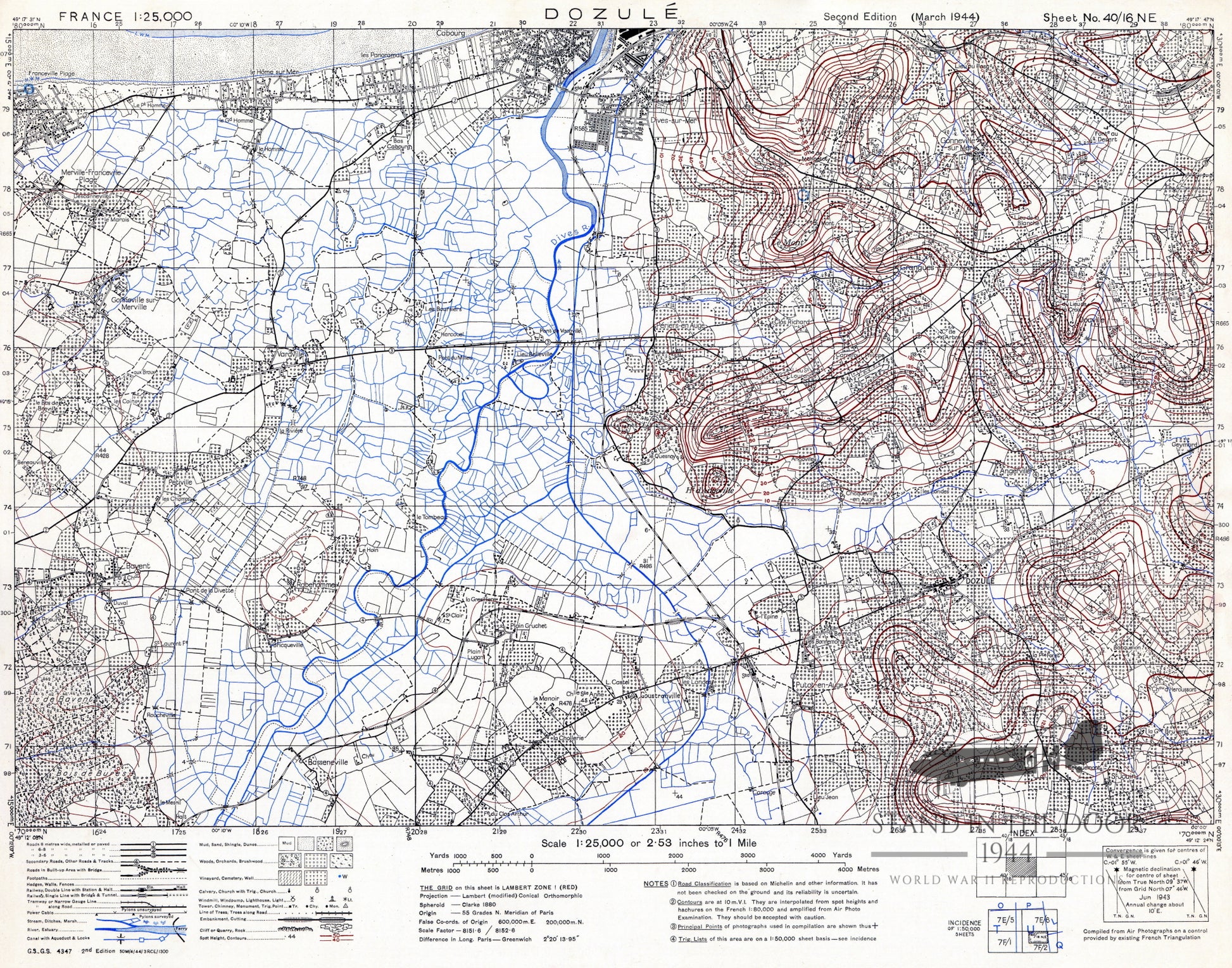 Reproduction "Dozule" map in 1:25,000 scale. Maps in this scale were the most common maps used by platoon leaders, company commanders, and senior platoon/company NCO's in Normandy for use in land navigation and tactical movements.