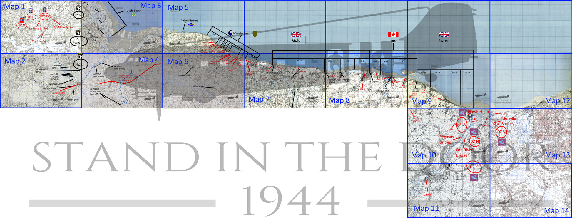 Keep in mind that geographic maps used in World War Two were not being made in relation to the tactical environment of the battlefield. Most if not all cartographers (map makers) did not know where the D-Day invasion (or any other invasion) was going to take place so you often find that key objectives are split over several different maps. That being the case officers and NCO's often carried numerous maps not knowing if their tactical movement would keep them on one map or take them across several maps.
