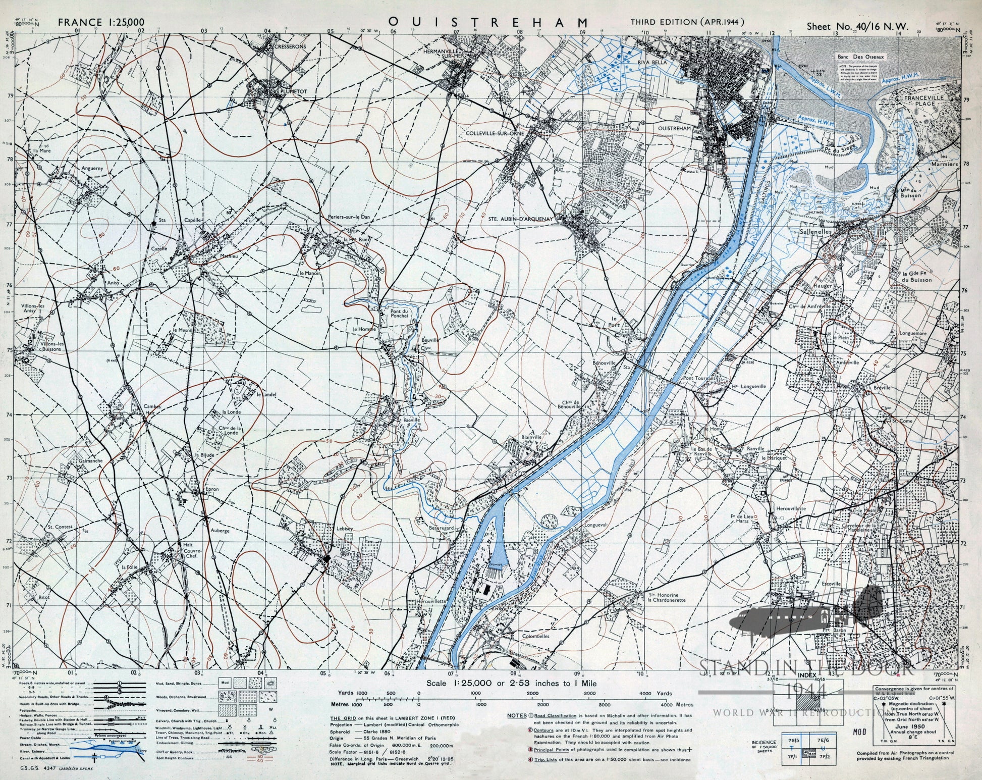 Reproduction "Ouistreham" map in 1:25,000 scale. Maps in this scale were the most common maps used by platoon leaders, company commanders, and senior platoon/company NCO's in Normandy for use in land navigation and tactical movements.