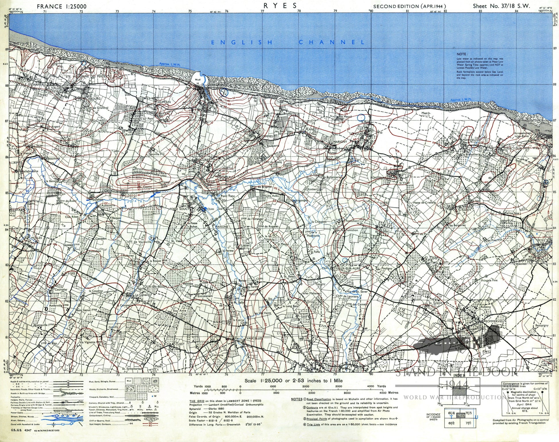 This map primarily shows the town of Reyes, Fox Red sector of Omaha beach, How Sector of Gold beach, and the inland areas behind the beaches. Although this map only shows a small section of the beach itself, this maps would have been critical that all officers and NCO's because it shows what is behind the beaches and what towns and road intersections are critical to capture and hold