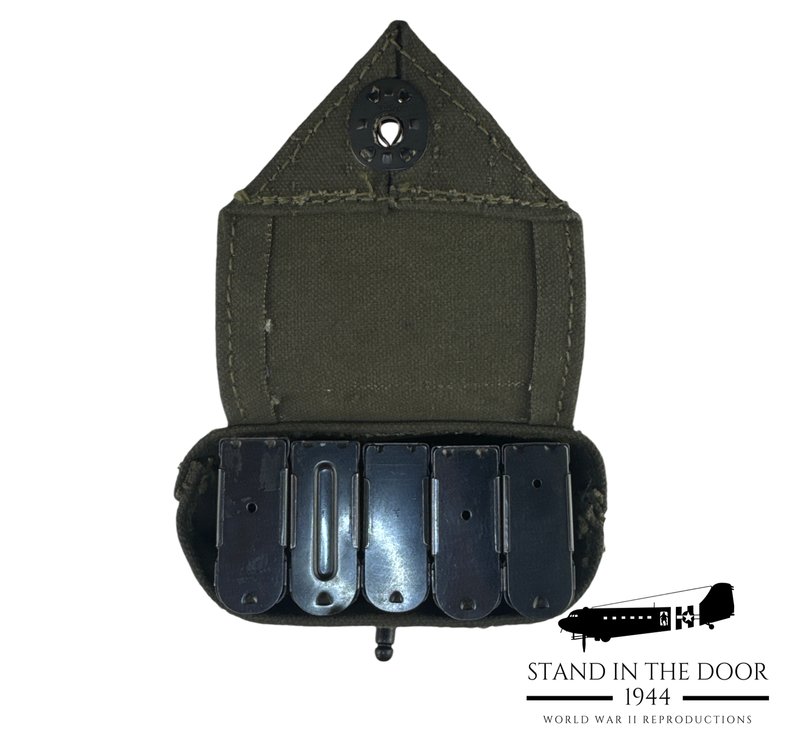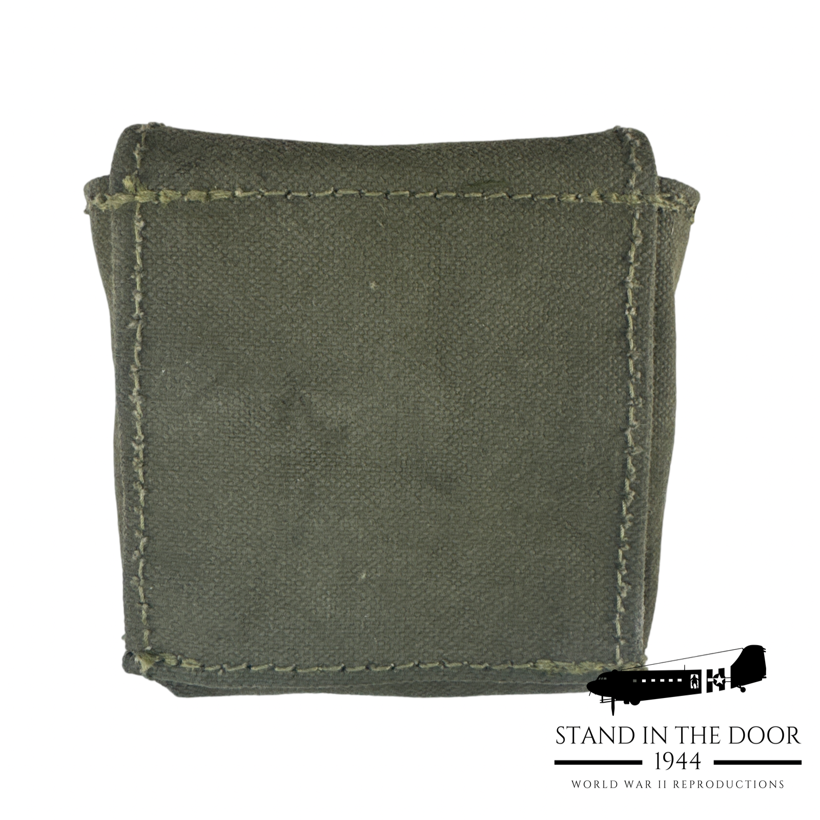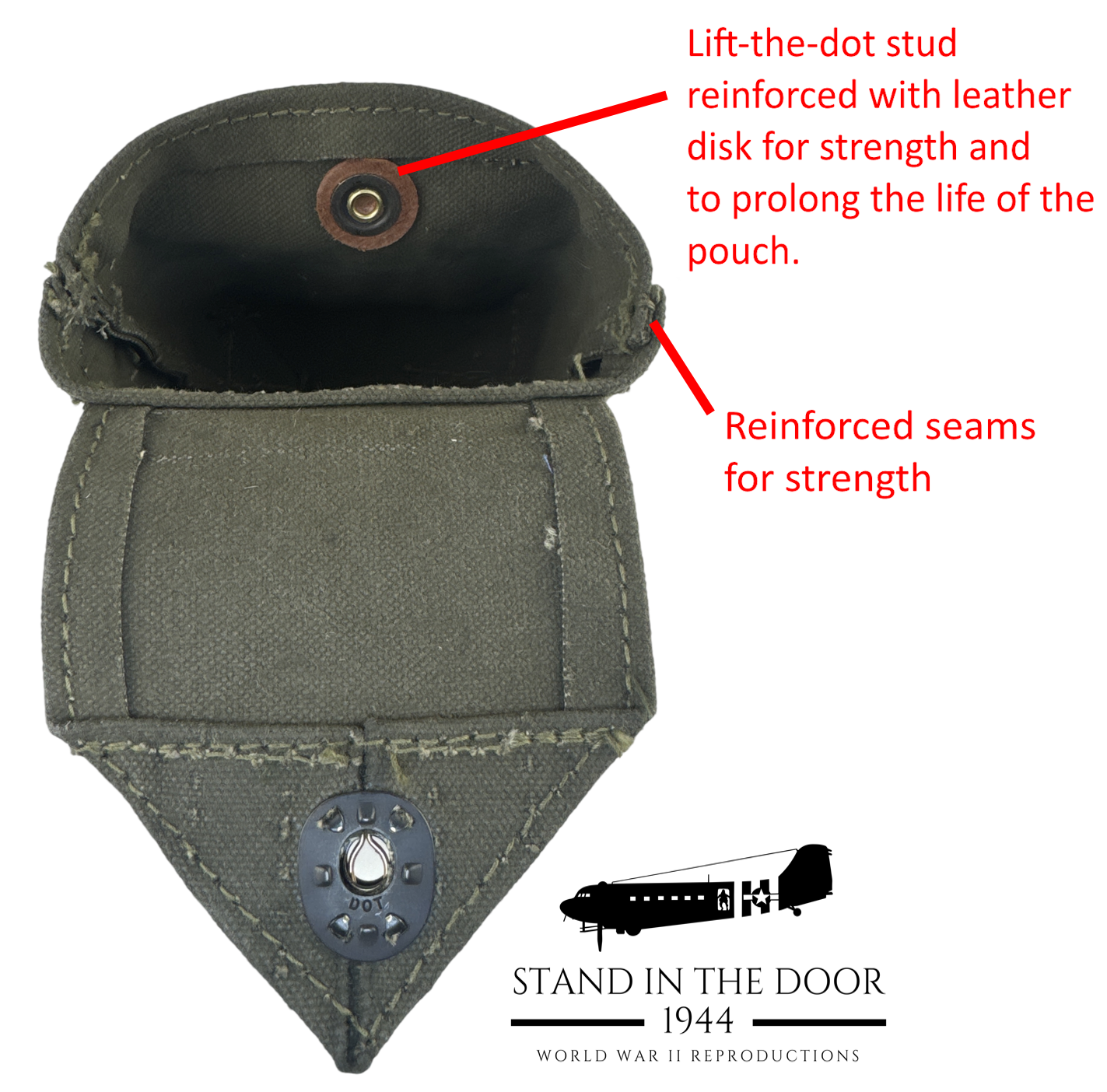 This model is a reproduction of the medium size which was the most common pouch. The medium size pouch can carry 2 MKII grenades or multiple M1 enblocs or carbine magazines These reproduction rigger pouches pouches are made with original OD7 tent canvas and are fastened with genuine lift-the-dot-fasteners.