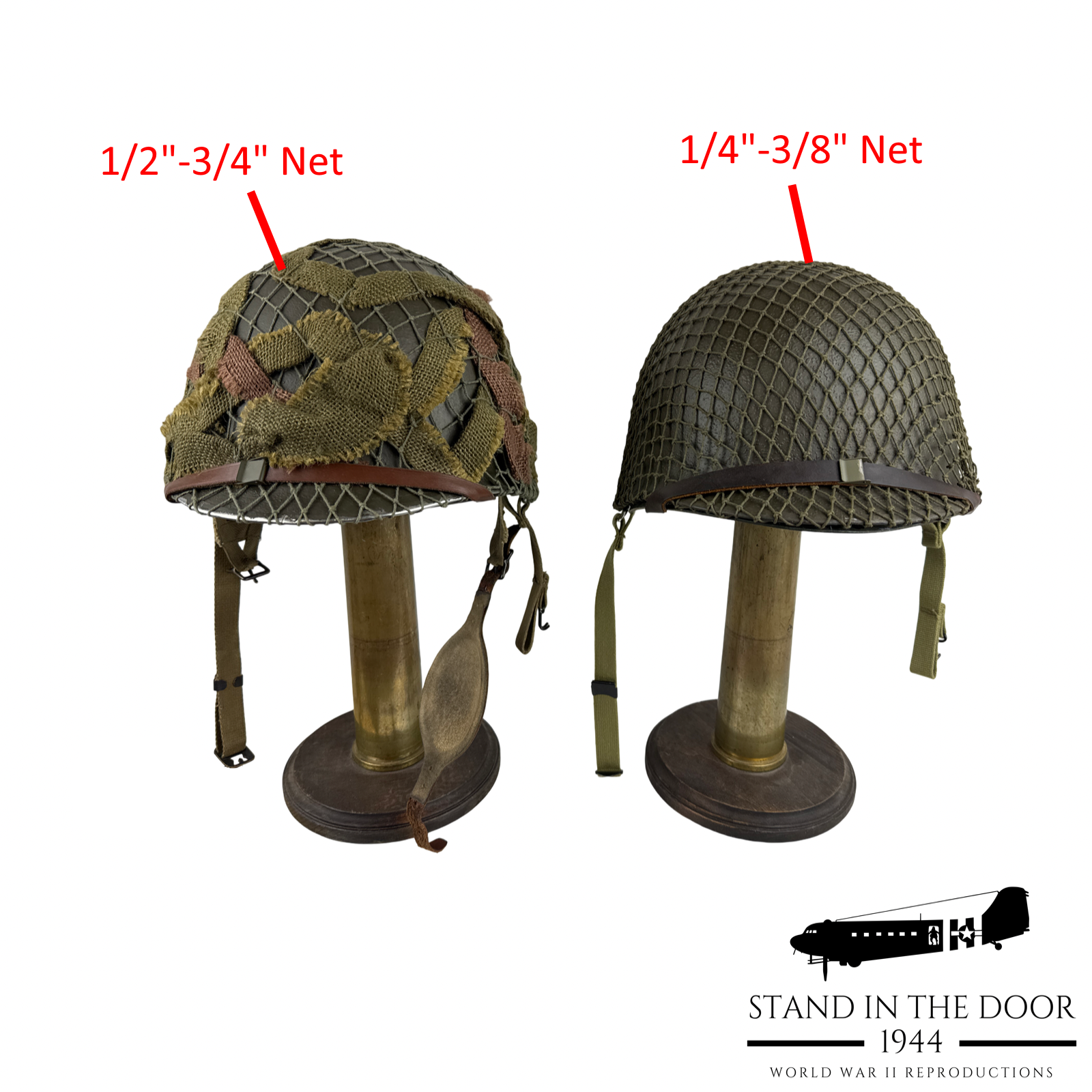 These nets are ORIGINAL "late war" era helmet nets used extensively from mid 1944 through the end of the War. This is a new batch of nets that are different than our previous batches of originals. The main differences are the strings are slightly thicker and the holes range from 1/4"-3/8". Given that the strings on these nets we highly suggest trimming out the excess netting and restringing the net so that there is less material sitting between the liner and the inside of the steel shell. This allows for a cleaner look (see attached pictures)