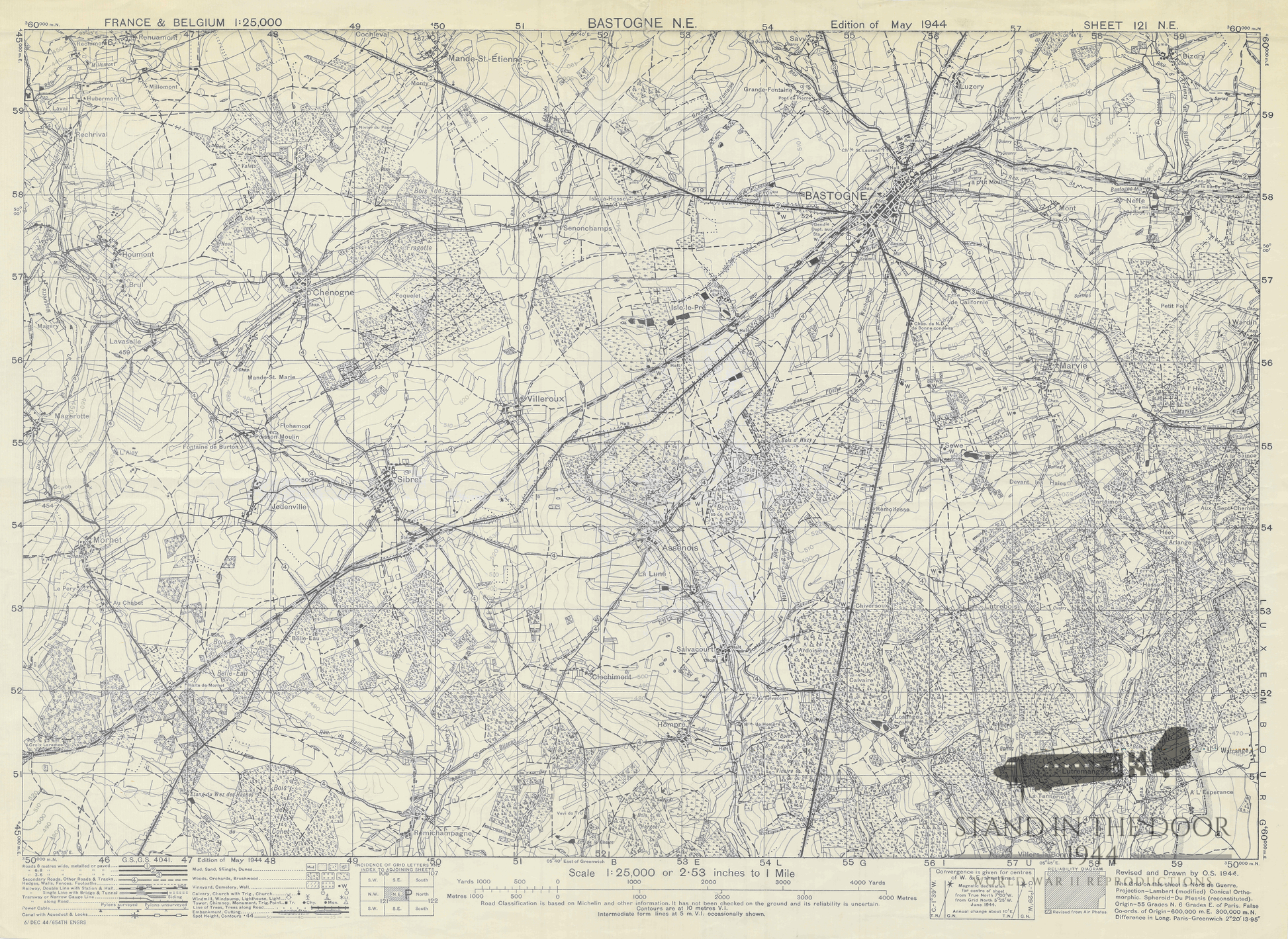 Reproduction "Bastogne NE" map in 1:25,000 scale. This map would have been the most common from Division Headquarters all the way down to platoon leaders, company commanders, and senior platoon/company NCO's during the defense of Bastogne for use in land navigation and tactical movements.