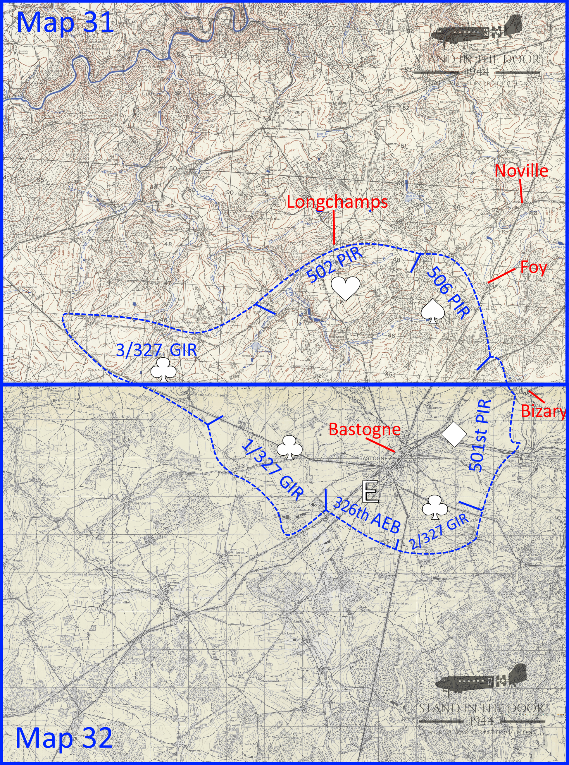 This map primarily shows the city of Bastogne as well as the surrounding areas to the east, south and west. As you can see on the second picture of this listing the southern half of the defensive perimeter around Bastogne is featured on this map including the 501st defensive sector to the east from Bizory to Marvie, the 326th/327th defensive sector to the south from Marvie to Mande- St. Etienne, and a section of the 506th Defensive sector North or Luzery. The rest of the defensive perimeter can be seen on the St. Hubert SE map (not included in this listing).