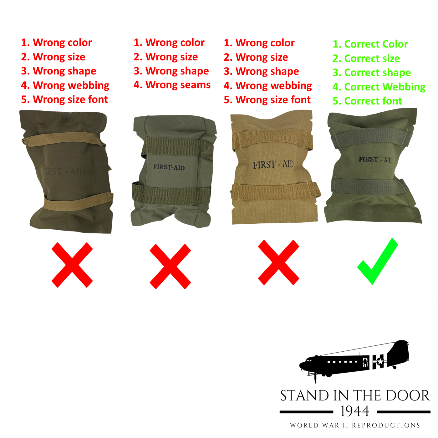 95% of all parachute first aid kits being reproduced today are absolutely horrible. Most of them use incorrect fabric and webbing in the wrong colors and they are filled with wadded up fabric that makes them not even close to the same shape and size of an original packet.