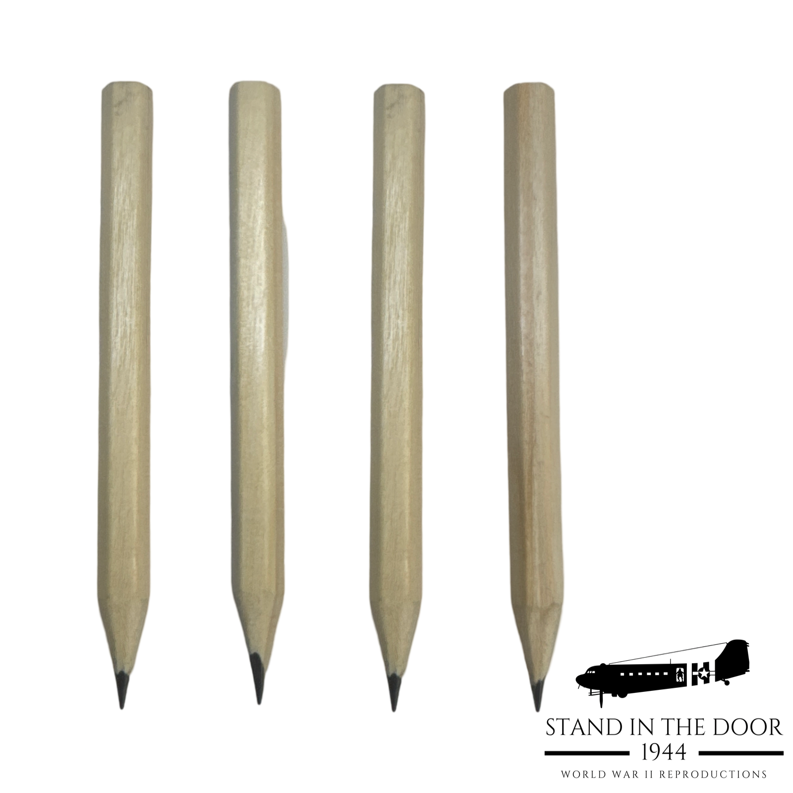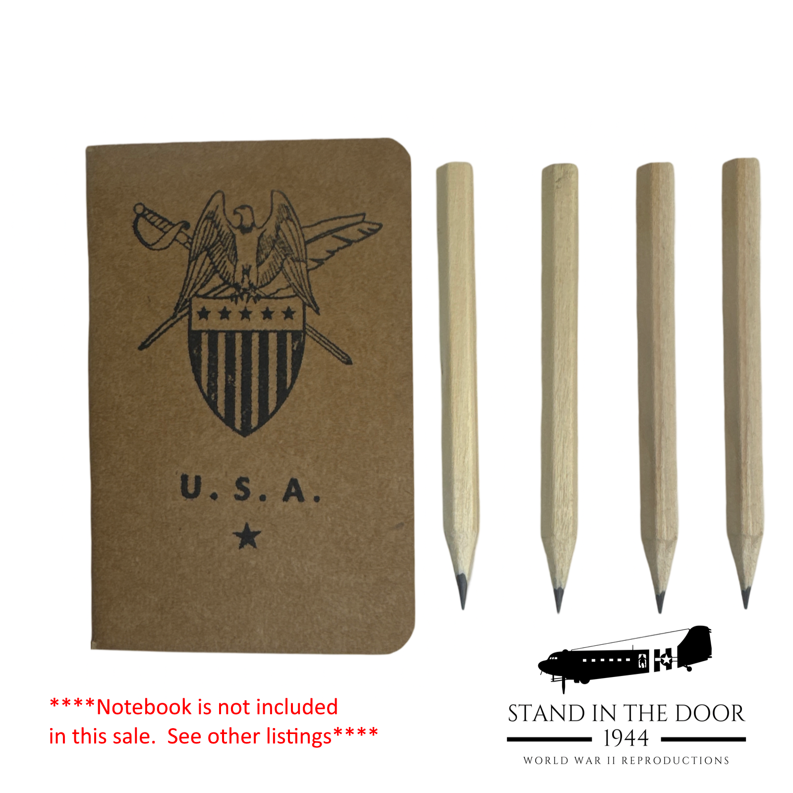 This listing is for 4 miniature wooden pencils ideally used with our squad leader notebooks (notebook is not included in this sale, see other listings). These pencils are raw unfinished wood with no erasers as was the most common style during WWII.