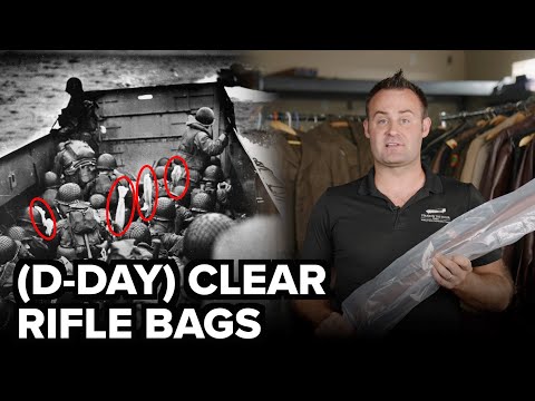 This is a reproduction of the CLEAR rifle bags that were being used in amphibious landings throughout the war. Original bags were made of Pliofilm which was a rubberish plastic bag made by the Goodyear tire company. As you can see from the original photos from dating from Normandy and before, all the bags being used were clear. The green colored bags were not seen until the landings on Iwo Jima.