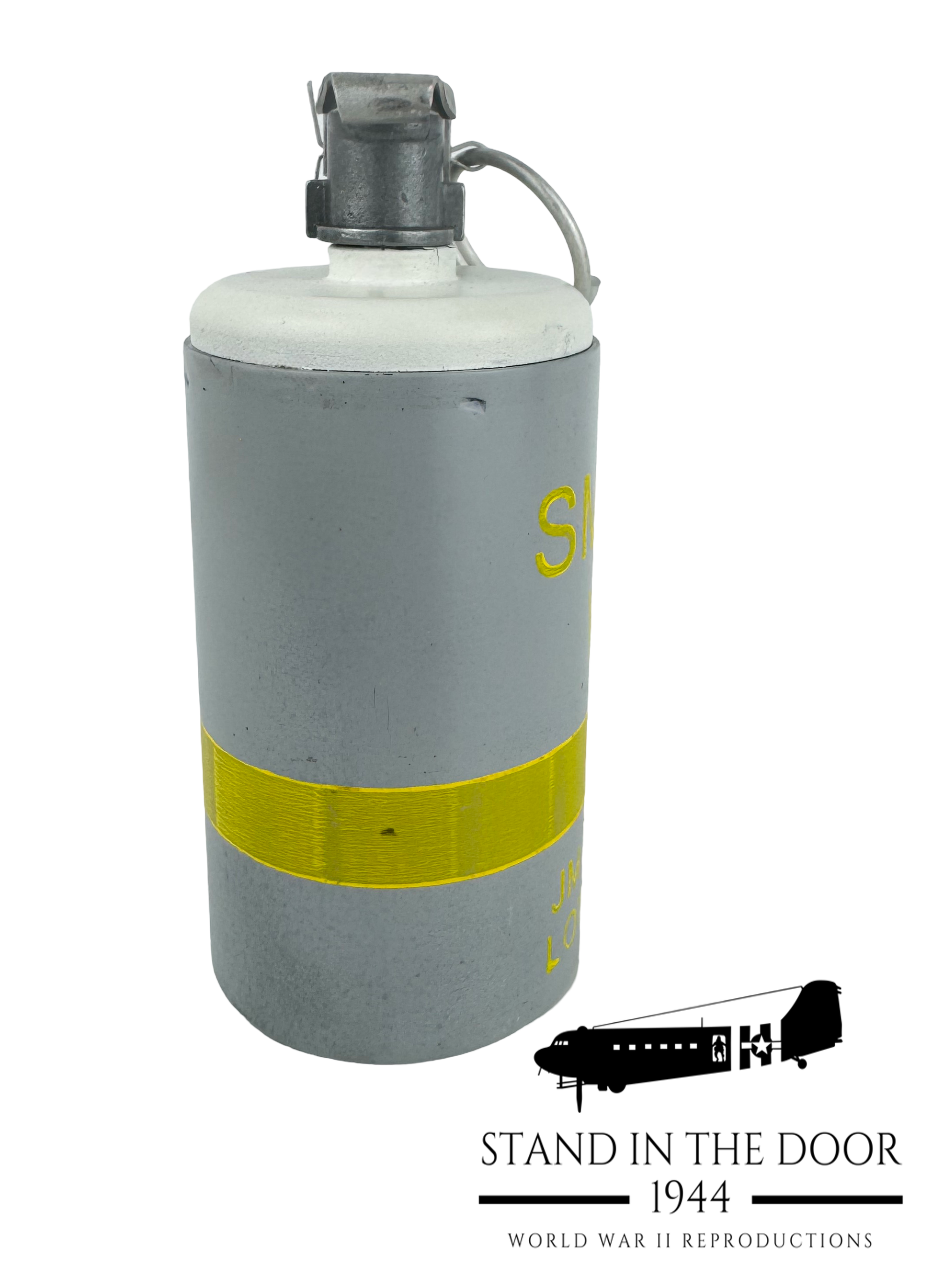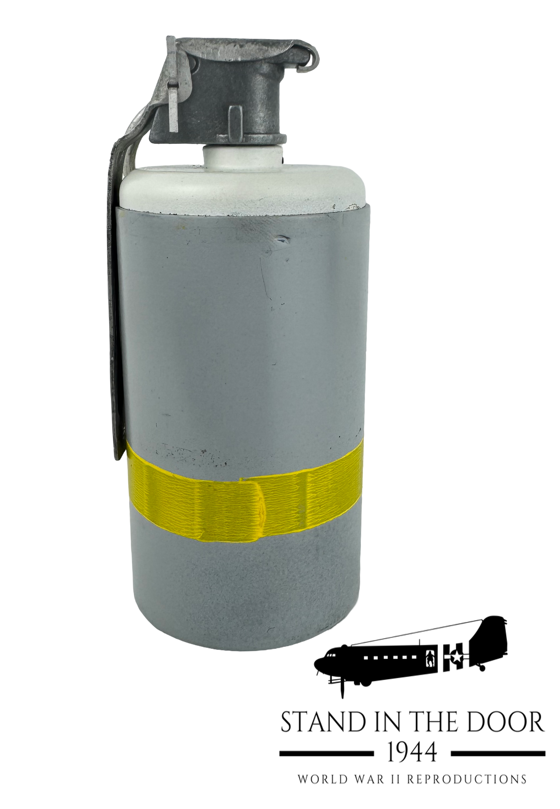 These are inert replicas of the USGI m18 smoke grenade used during and after WWII. The main bodies are made of heavy gauge steel with cast resin "endcaps." This design makes these replicas nearly indestructible. Unlike other repos on the market, these replicas feature the proper MKII fuse cast is solid zinc alloy (the same metal used during WWII). These replicas are 100% inert and can not be made to function.
