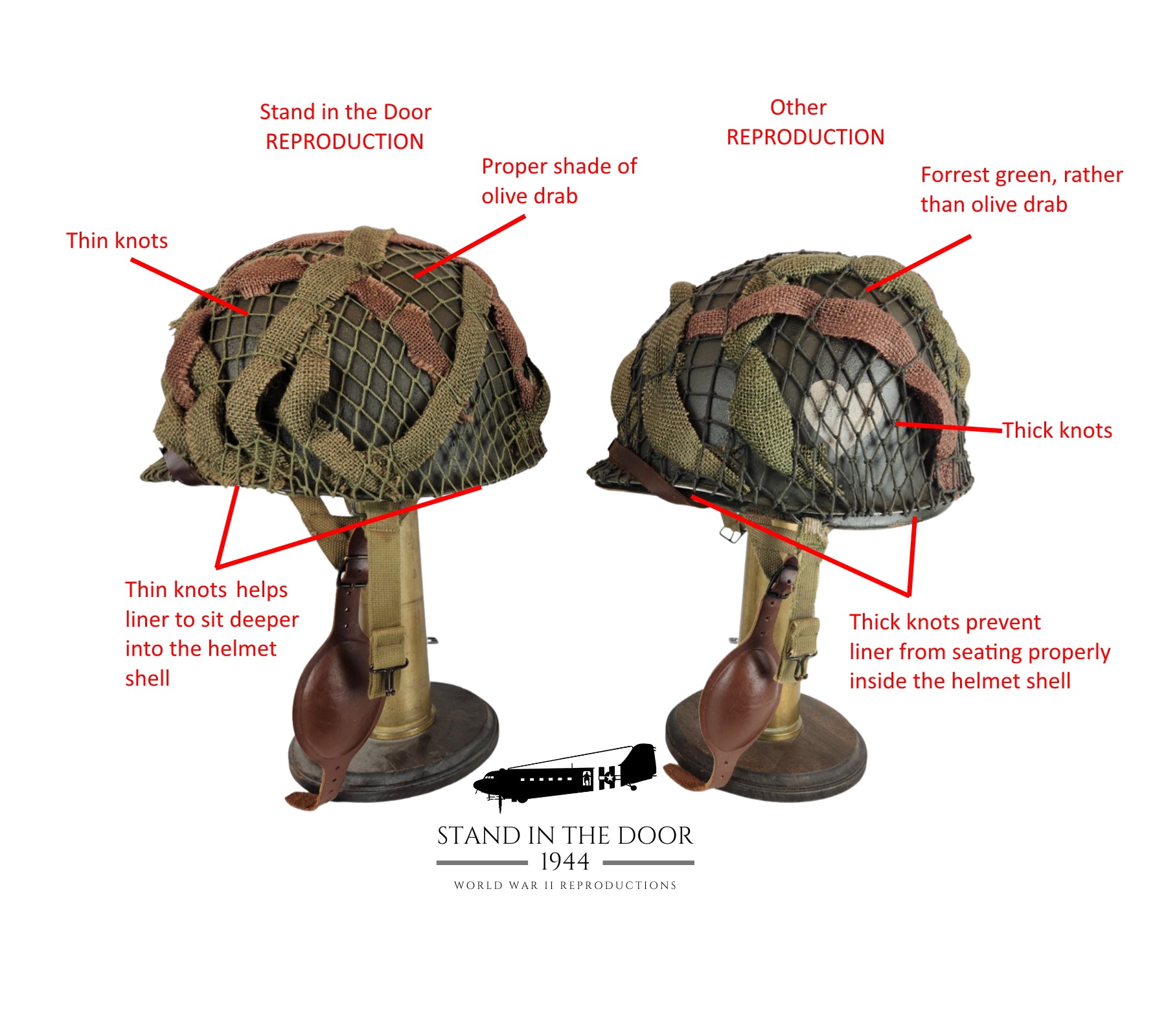 For those that own an original helmet net, these reproductions may not match your specific original perfectly. A brief internet search will show you that there were many different manufactures of these nets in both the United States and England, all of which used different size stings, knots, hole sizes, and colors. These helmet nets are an extremely faithful reproduction of one of the most common nets used during the war.