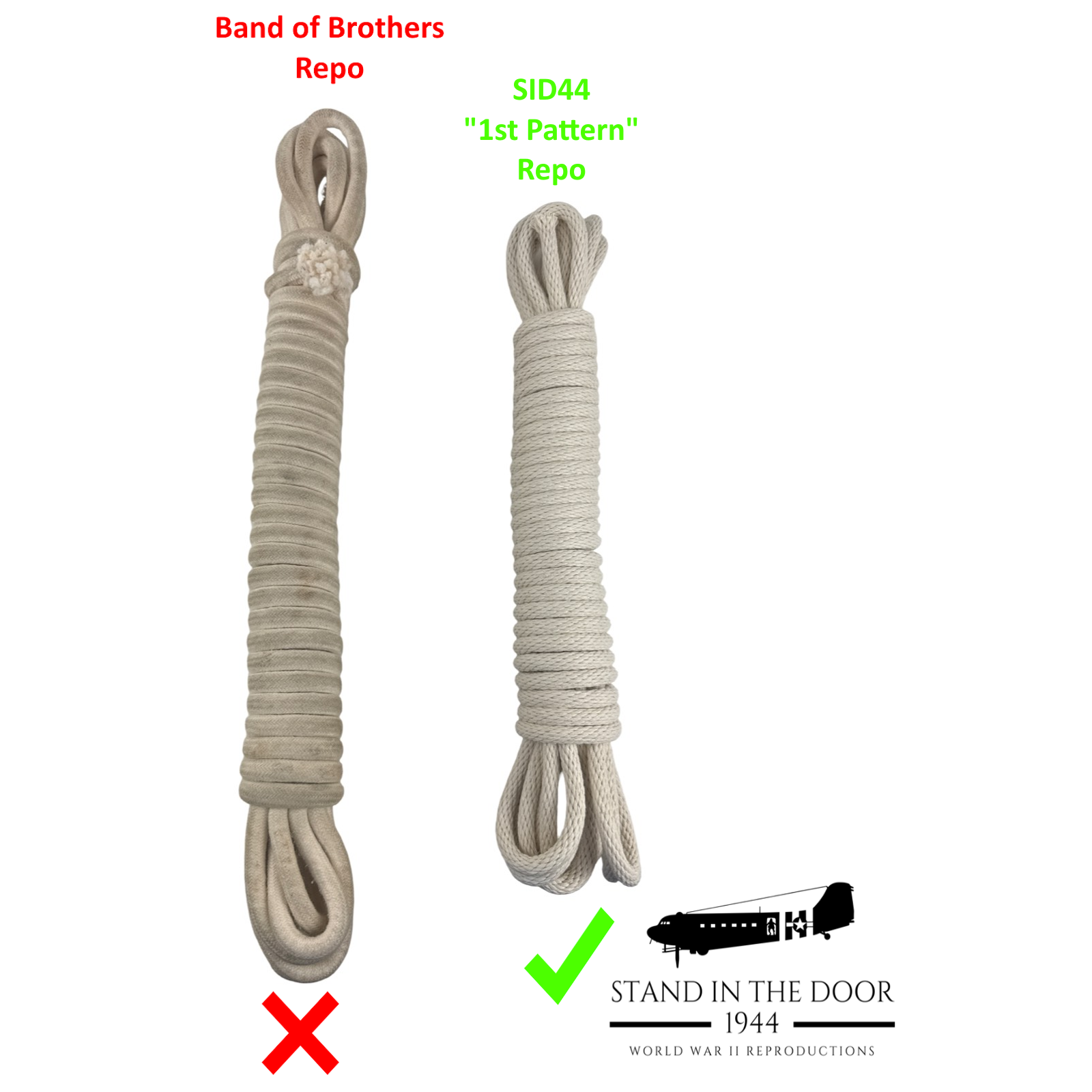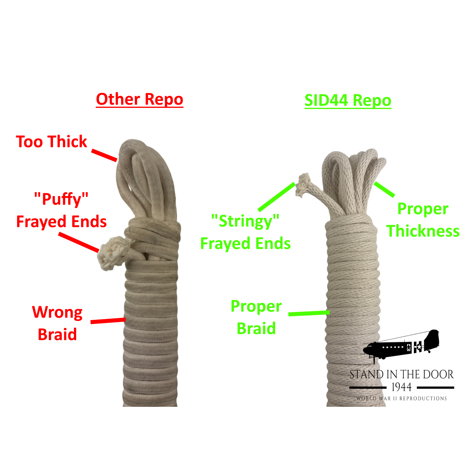 Our ropes have been compared side by side to original examples in the Deadman's Corner Museum in Normandy and they are a 1:1 match including the braid, thickness, and cotton construction. As you can see, the reproduction ropes being sold by most other companies (such as was used in the Band of Brothers miniseries) are not accurate reproductions of original ropes. The ropes are twice as thick as originals and feature a completely different braid.