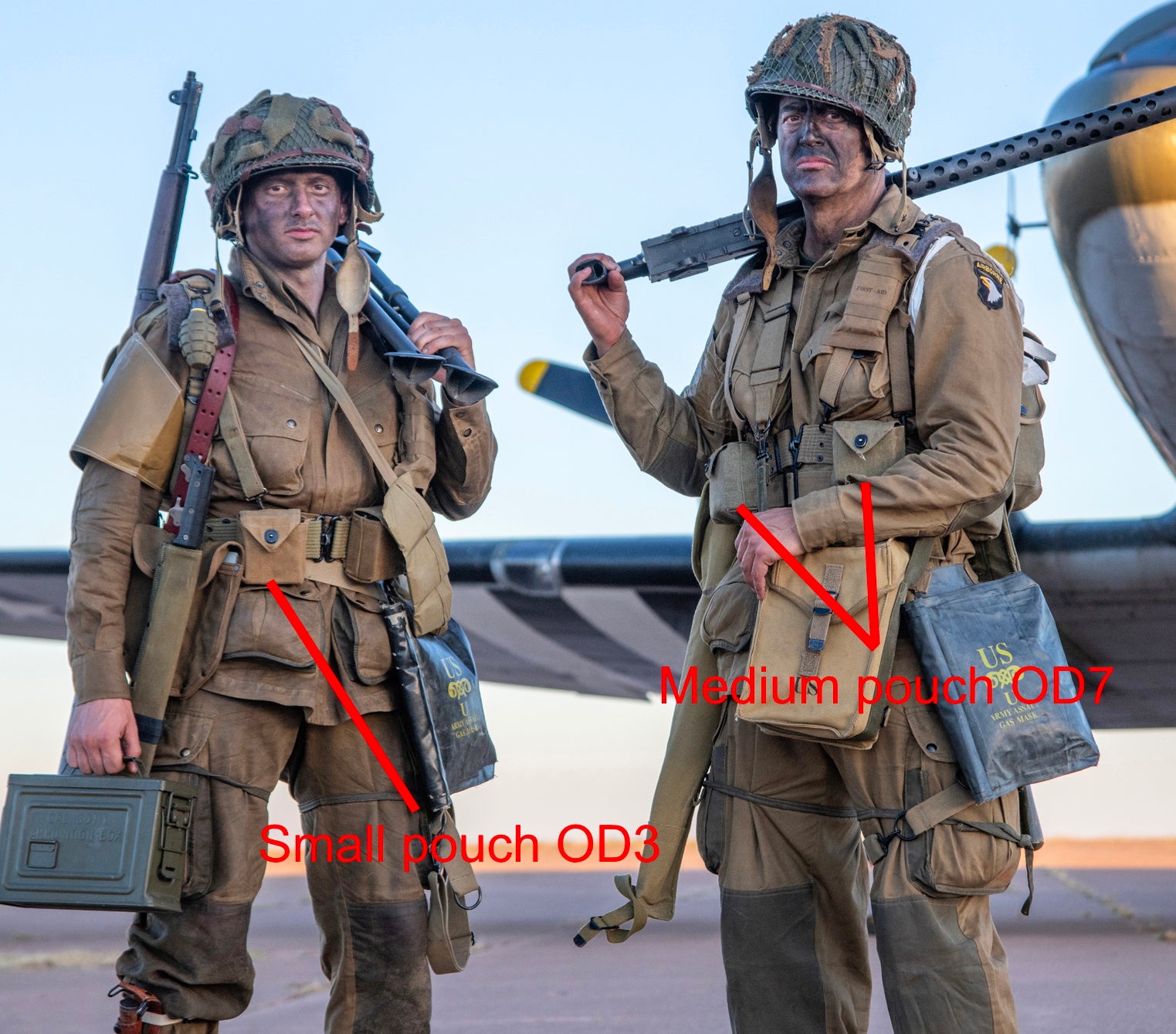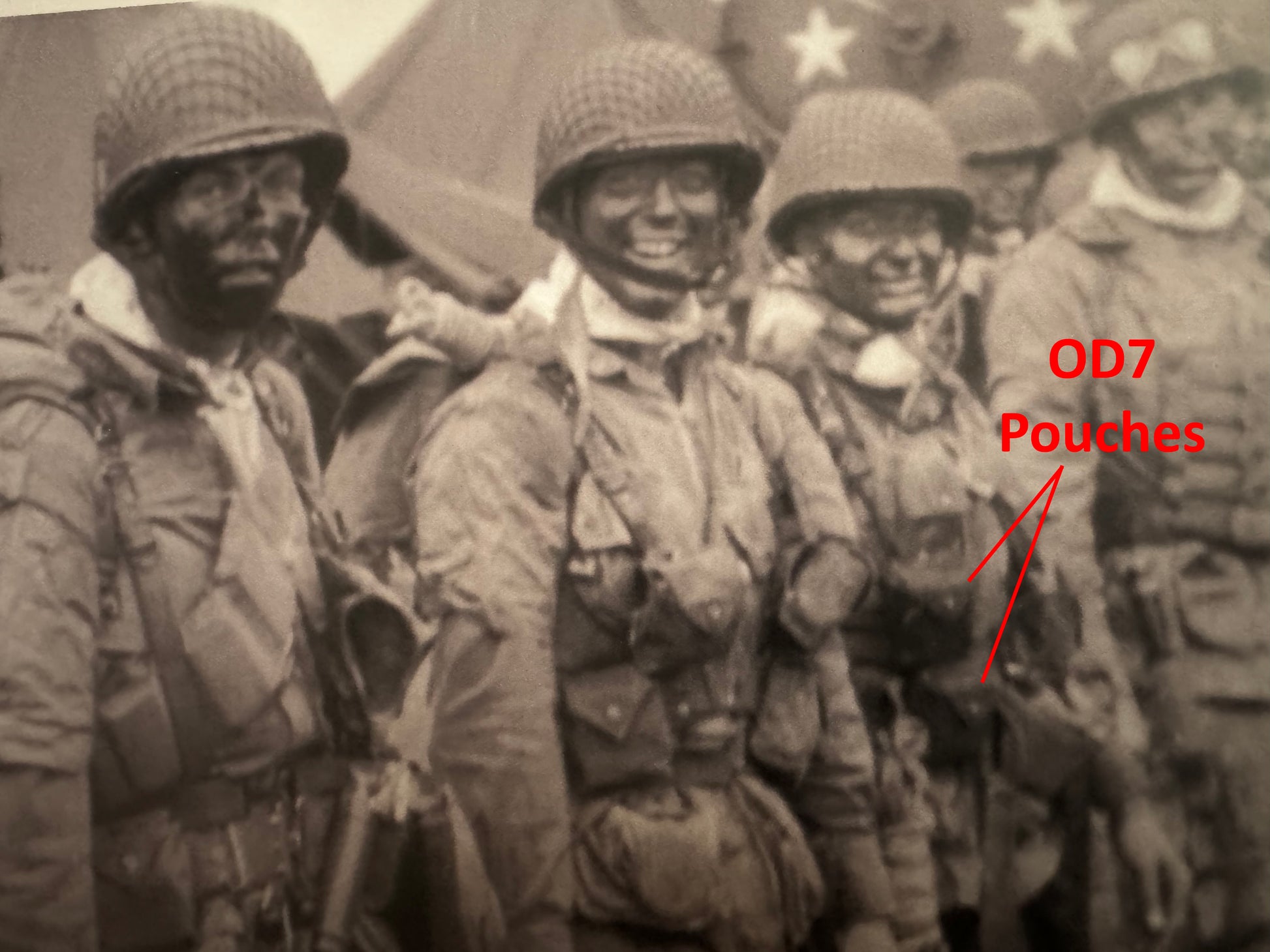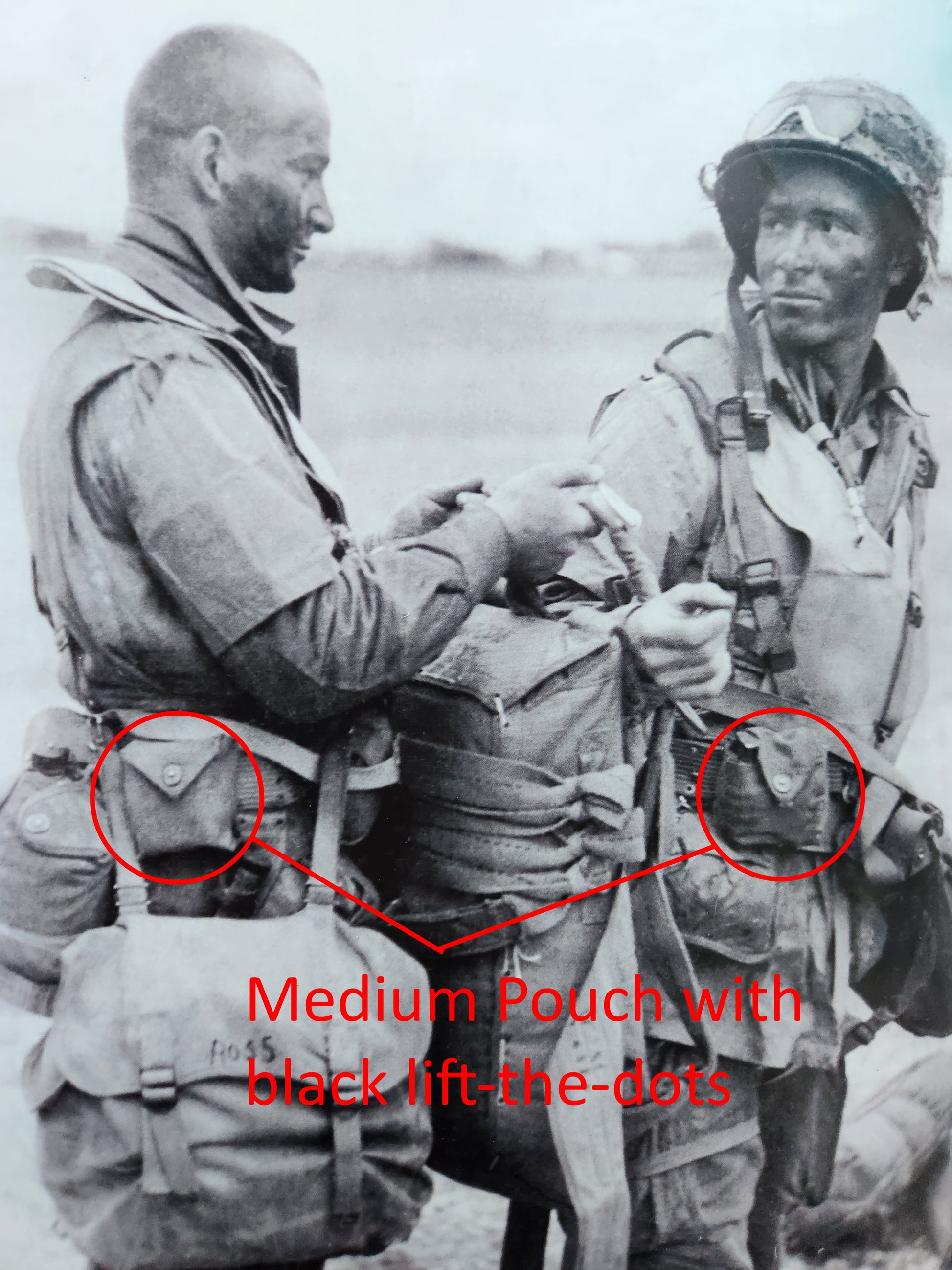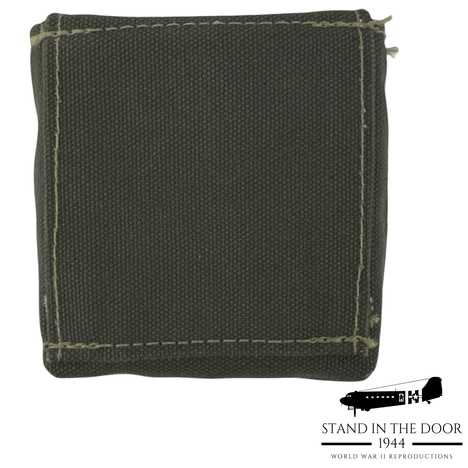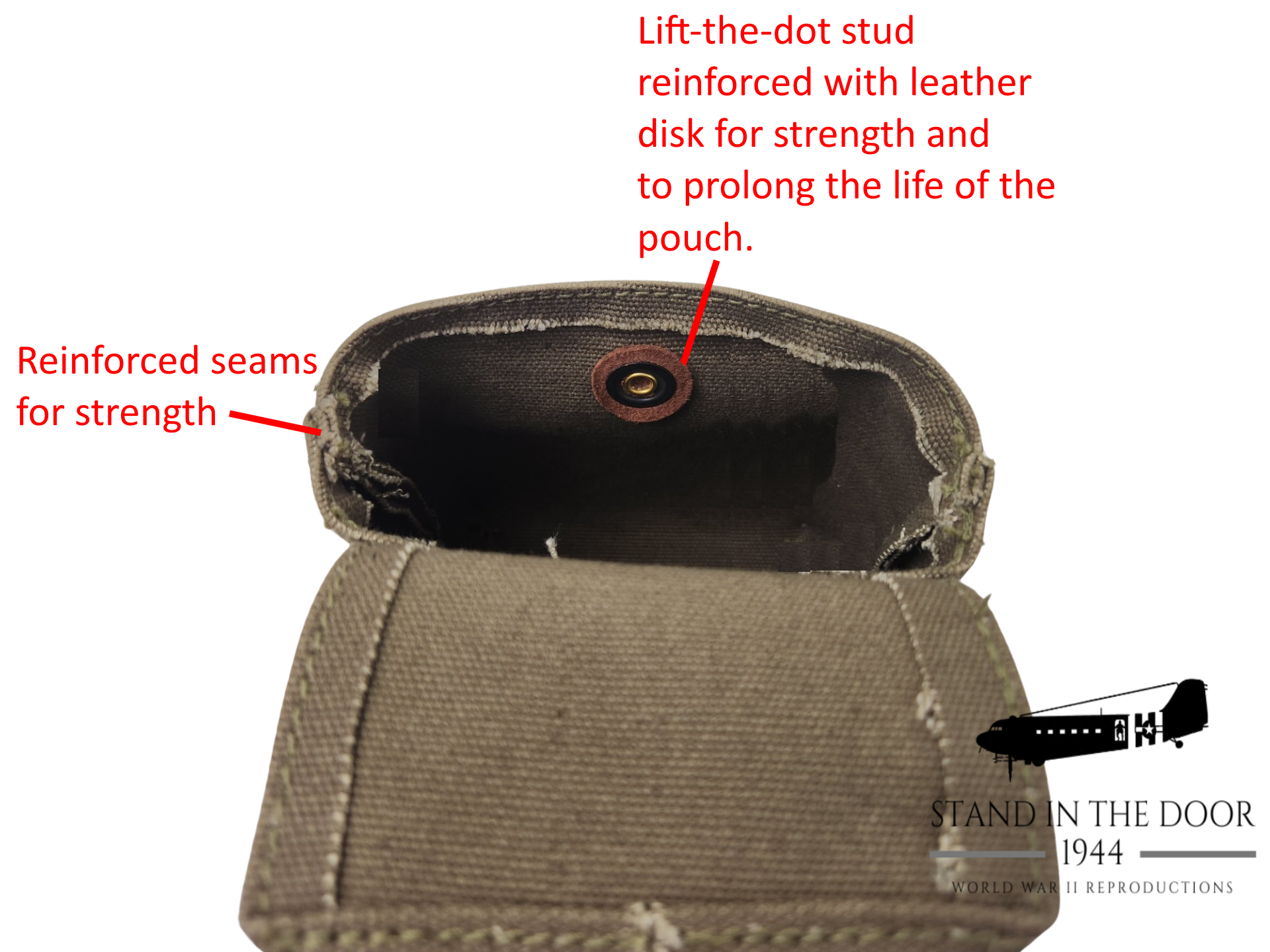 This model is a reproduction of the medium size which was the most common pouch. The medium size pouch can carry 2 MKII grenades or multiple M1 enblocs or carbine magazines These reproduction rigger pouches pouches are made with OD7 canvas and are fastened with genuine lift-the-dot-fasteners.