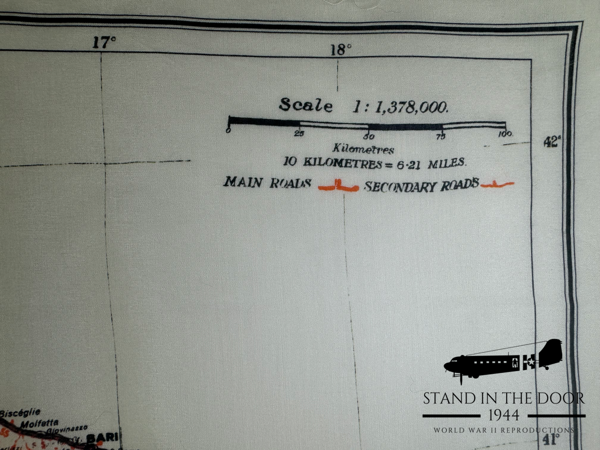 The Italy/Sicily map was designed as an "escape map" meaning that it was printed on a rather small bit of fabric which could be hidden easily on the body when captured as well as it was printed in an exceptionally large 1:1,378,000 scale. That being the case the map was not very useful for traditional military land navigation. There are no gridlines that can be scaled with a protractor and much of the smaller print is difficult if not impossible to read even under a magnifying glass due to its large scale as well being printed on the porous surface of fabric instead of the smooth surface of paper. Rather it was used primarily to determine a person's general geographic location so they could plan a route to "neutral" counties like Switzerland and Spain and be smuggled back to England.