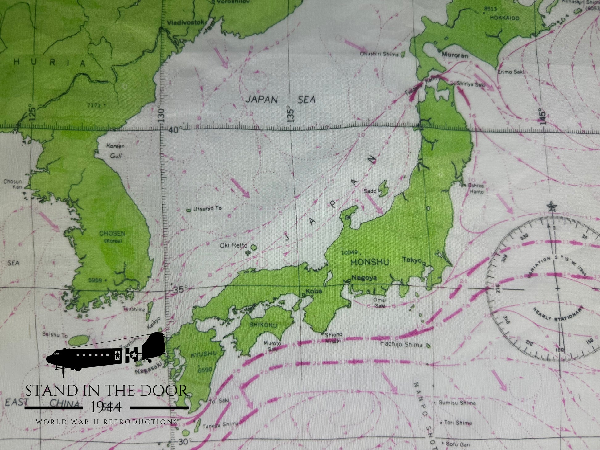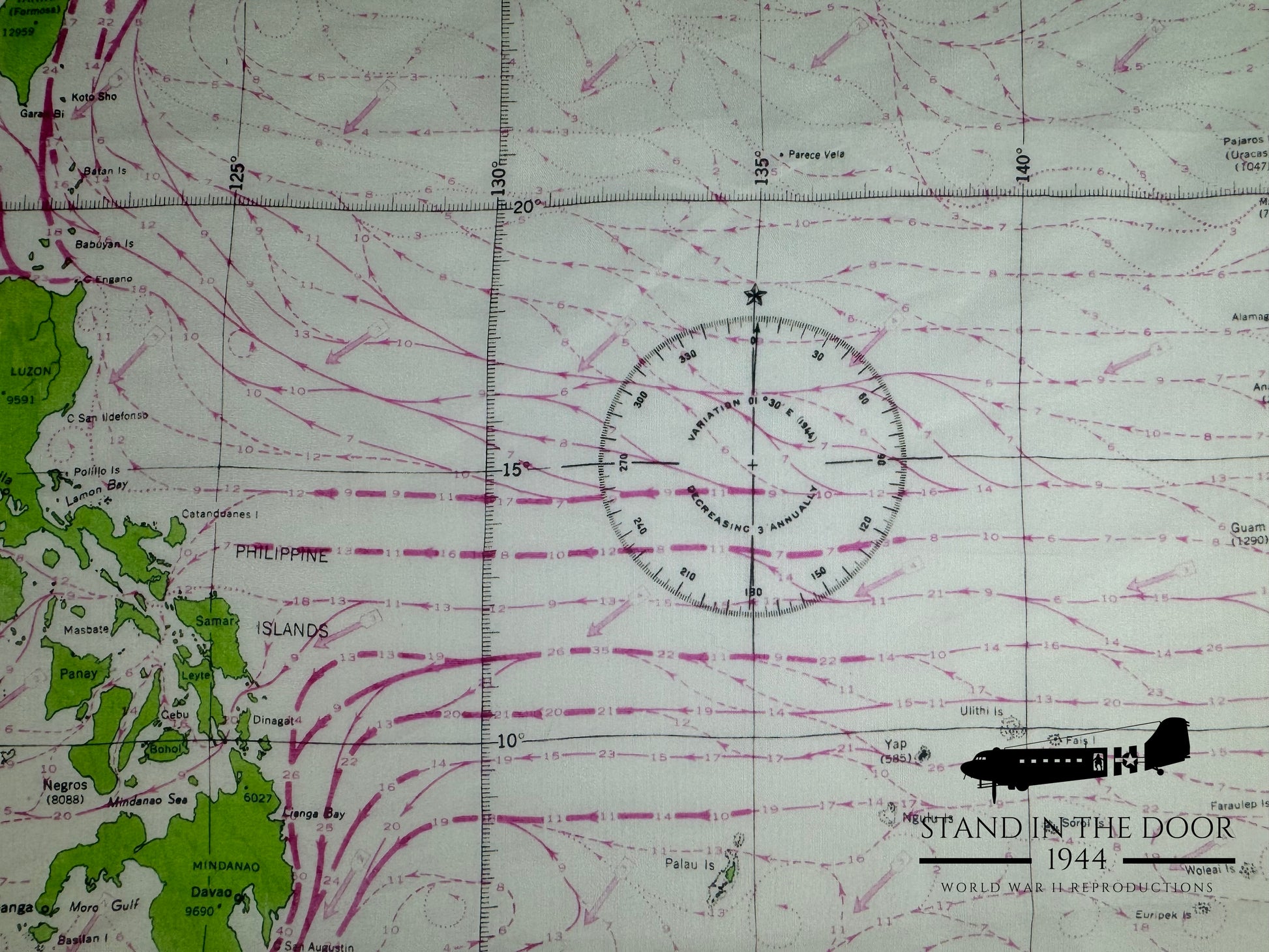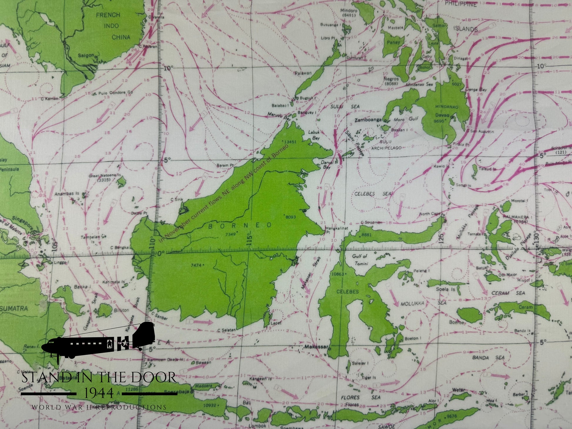 An interesting detail of these Western Pacific Escape maps compared to other escape maps of WWII is the vast amounts of ocean seen throughout the map. Beings that aircrews were more likely to go down in the ocean rather than on land the war department went to great lengths to chart the ocean currents to give servicemen the best opportunity to survive.