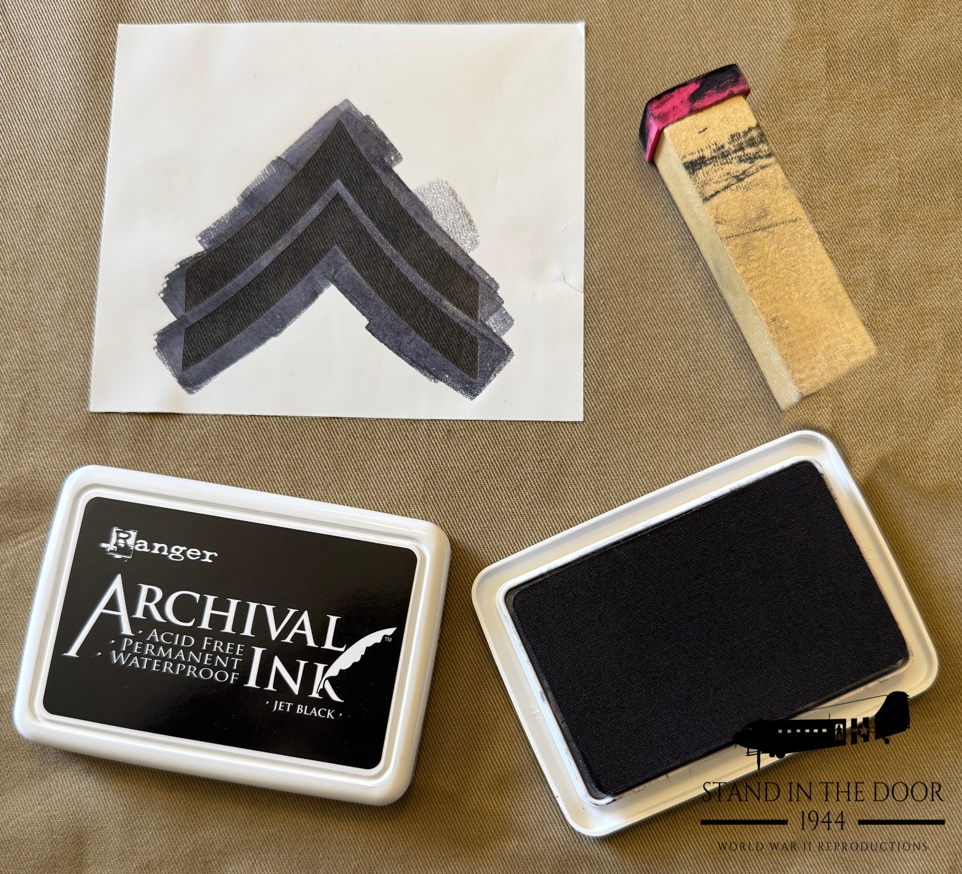Our reproductions are made using proper WWII chevron sizes cut into "sticky-back" vinyl stencil paper. The sticky backing on the stencil allows the user to apply the stencil to a jacket without risk of the stencil moving before the application of ink. The sticky backing also helps prevent ink from going into unwanted areas of the fabric.