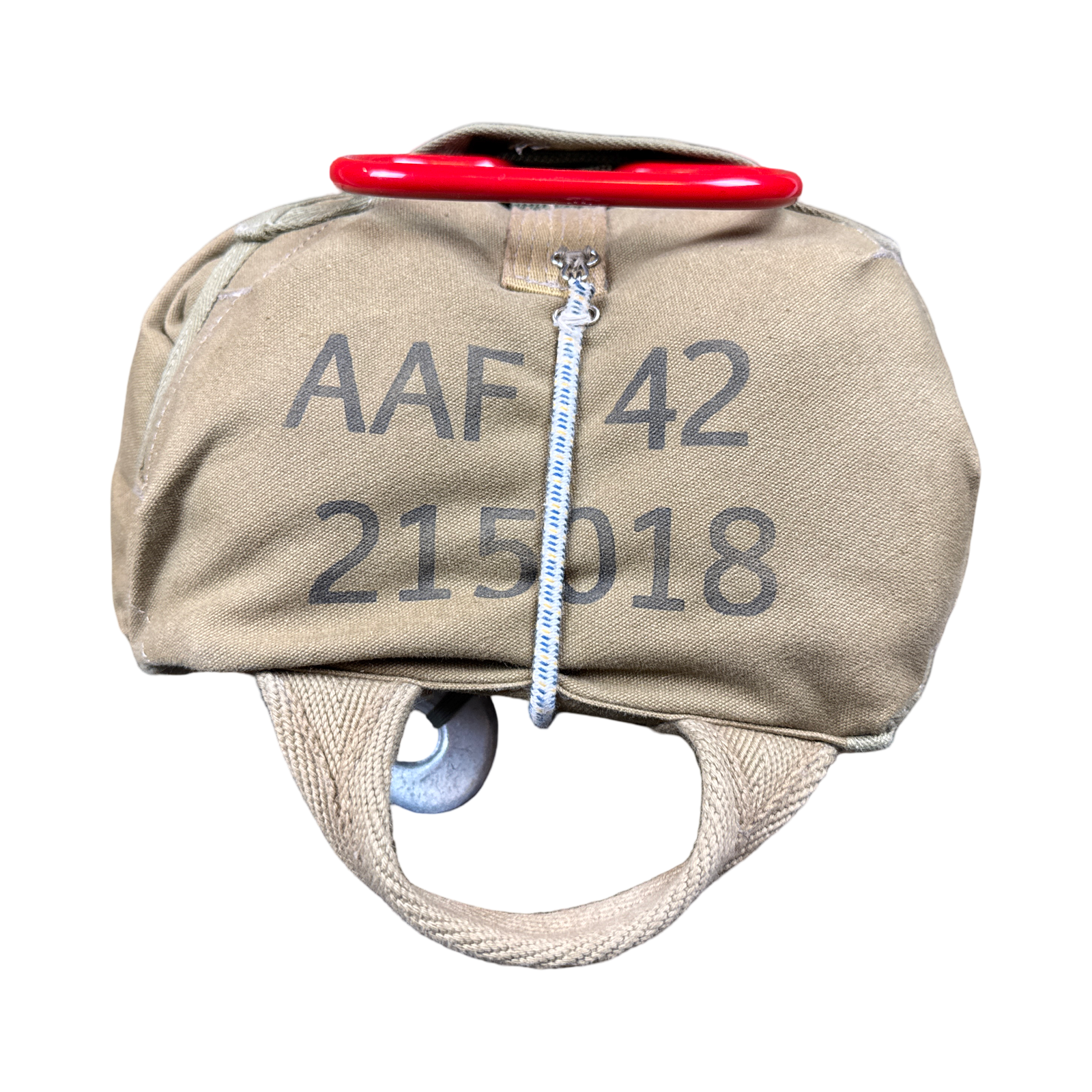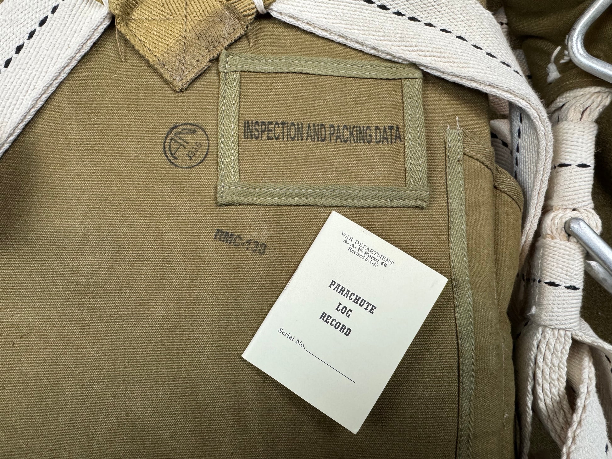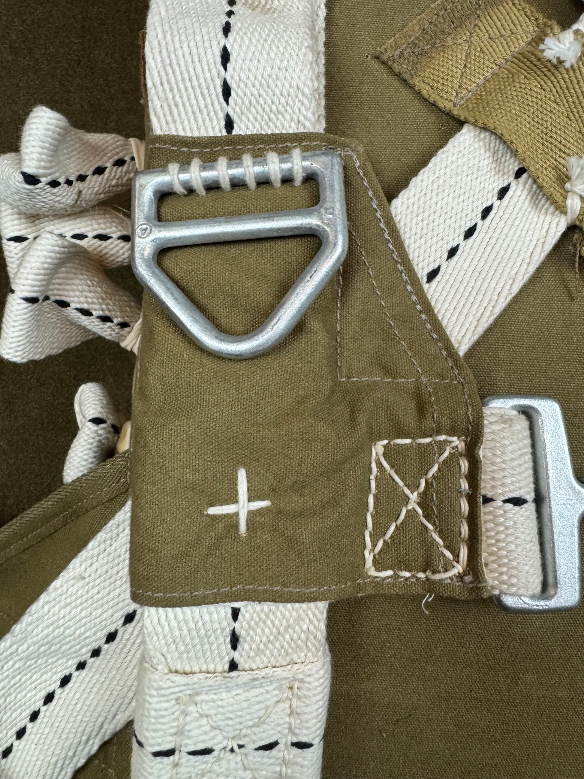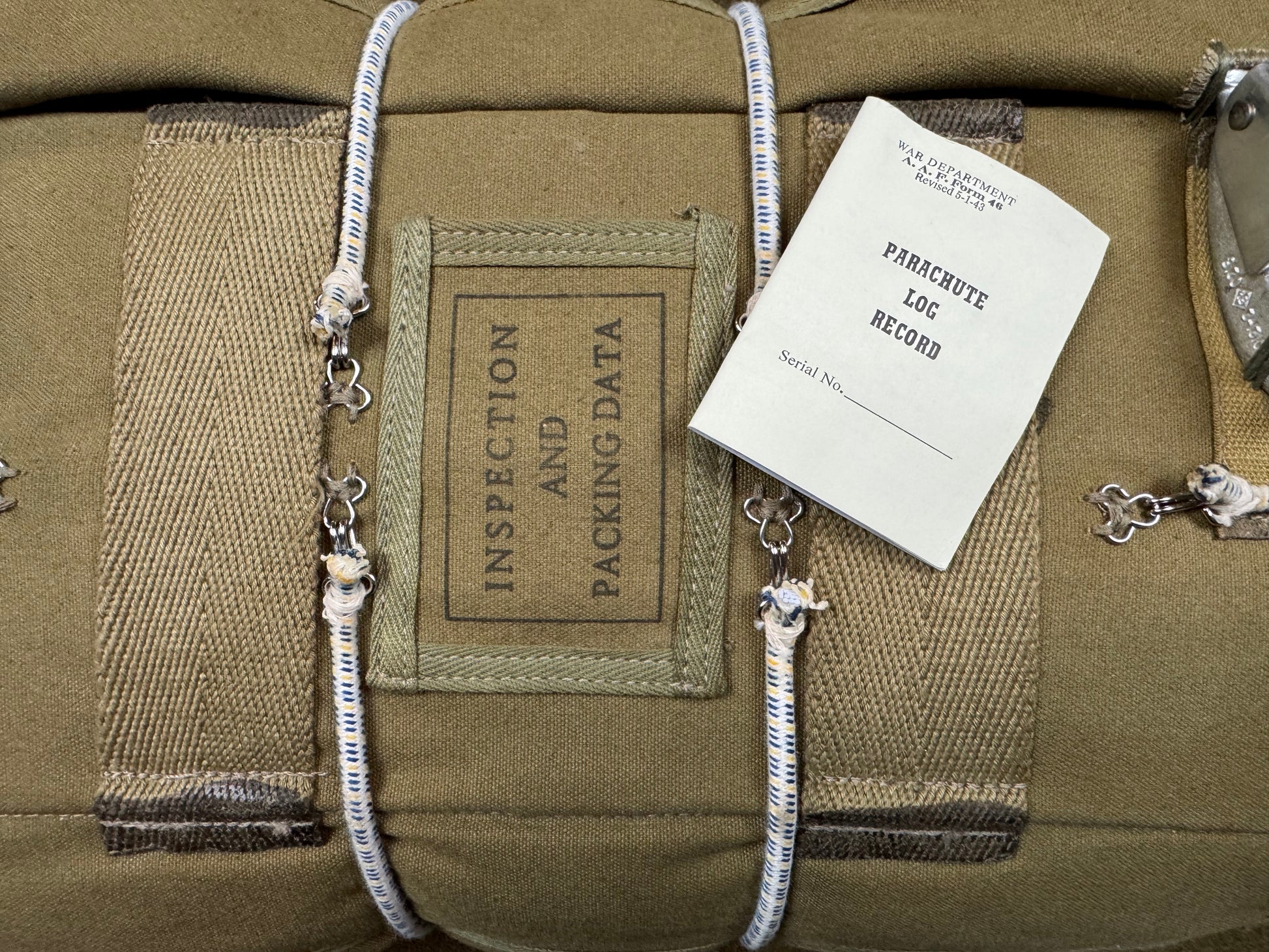The hardware all looks to be original with the exception of the 5th model snap hook. The main pack and the reserve both have parachute canopies inside them. The canopy in the main pack is for sure a post war canopy as it has rip stop fabric (see photo). The canopy in the reserve pack is not rip stop fabric so it could be original but we cannot guarantee that. Additionally we do not know the condition of the lines on the main canopy or the reserve, they could be fully attached to the pack trays but they could also be loose or even cut. Unfortunately the only way to confirm the condition of the lines is to cut the pack ties and the rigger seal which we are not wanting to do for obvious reasons.