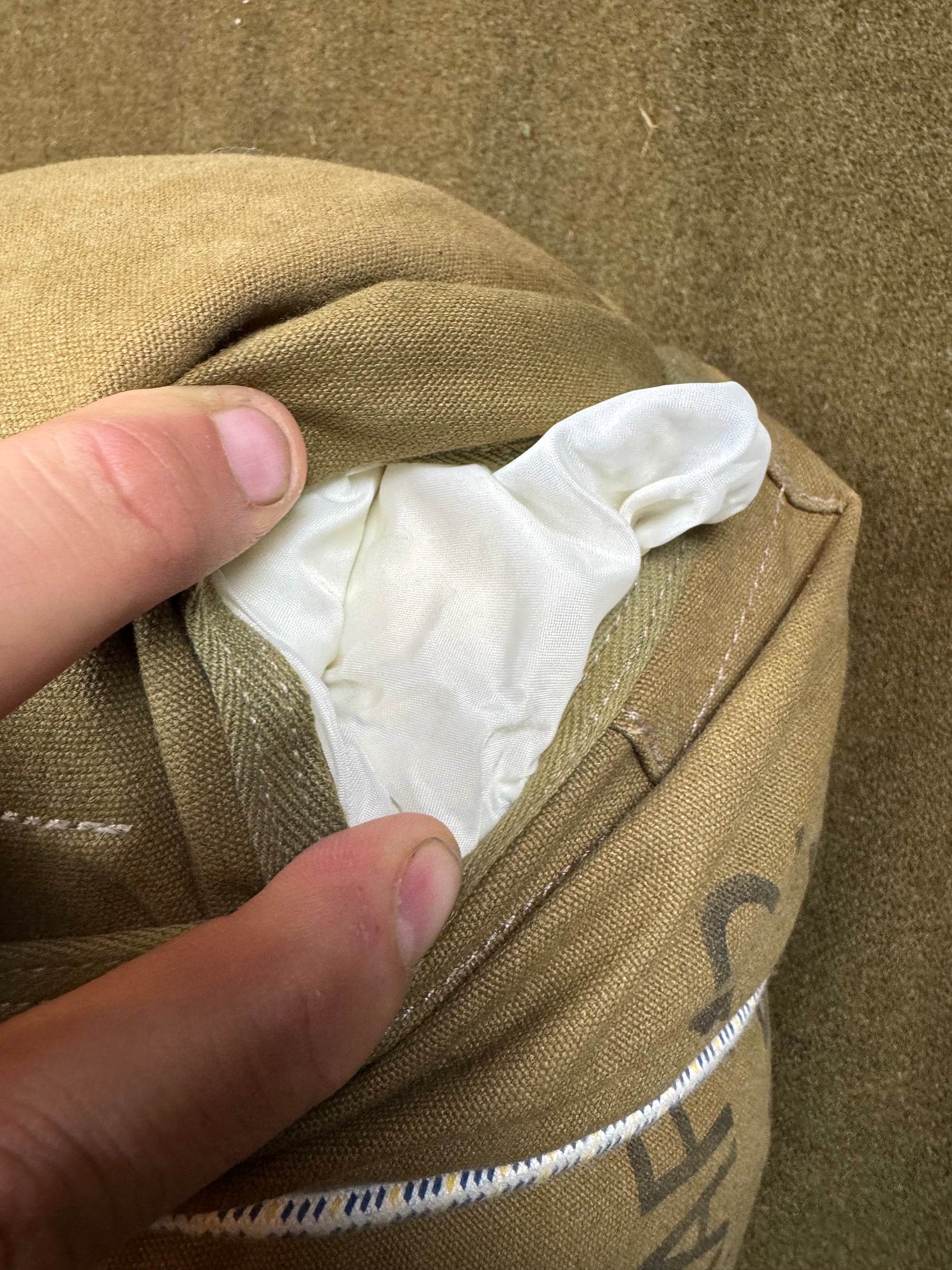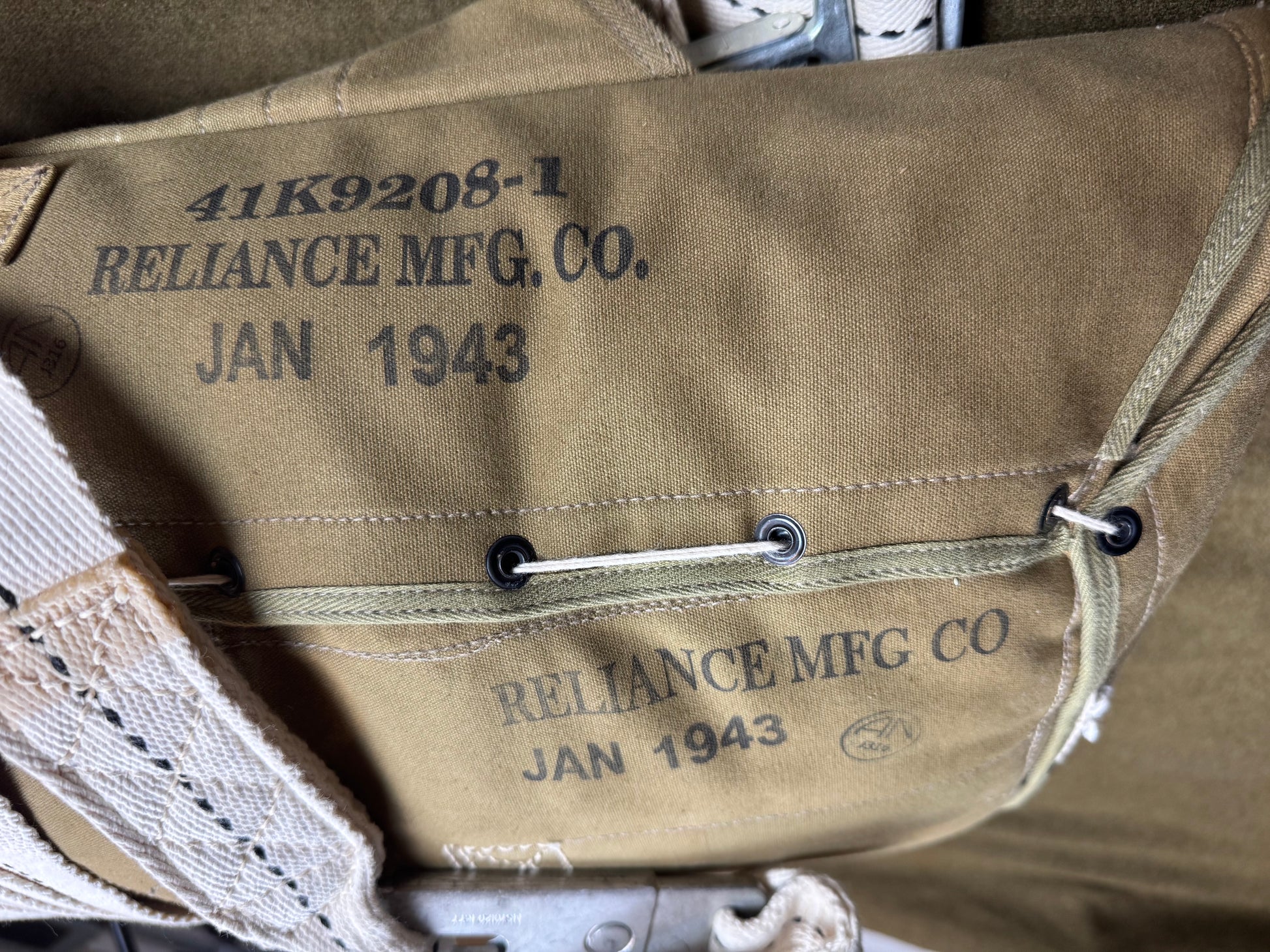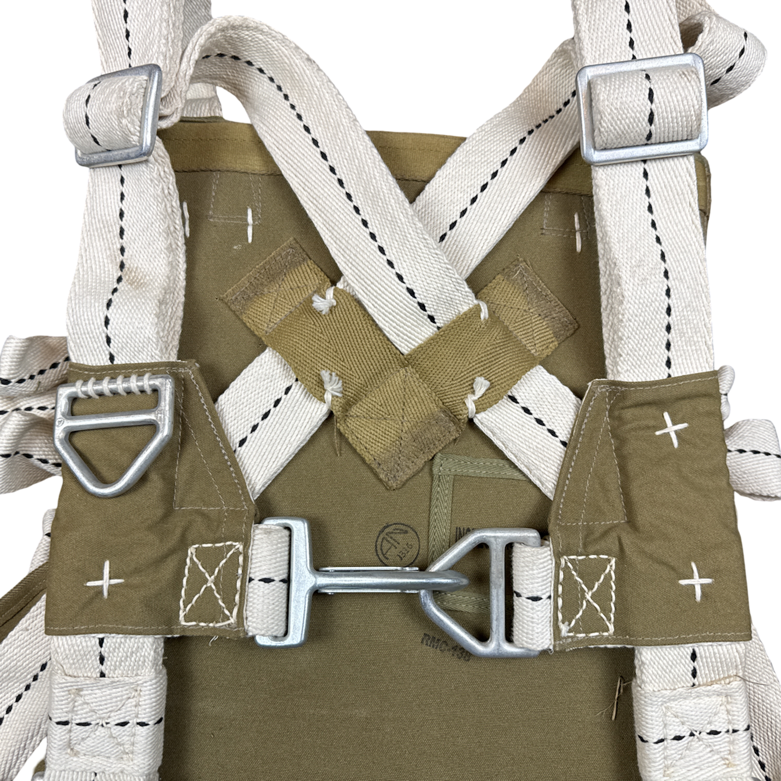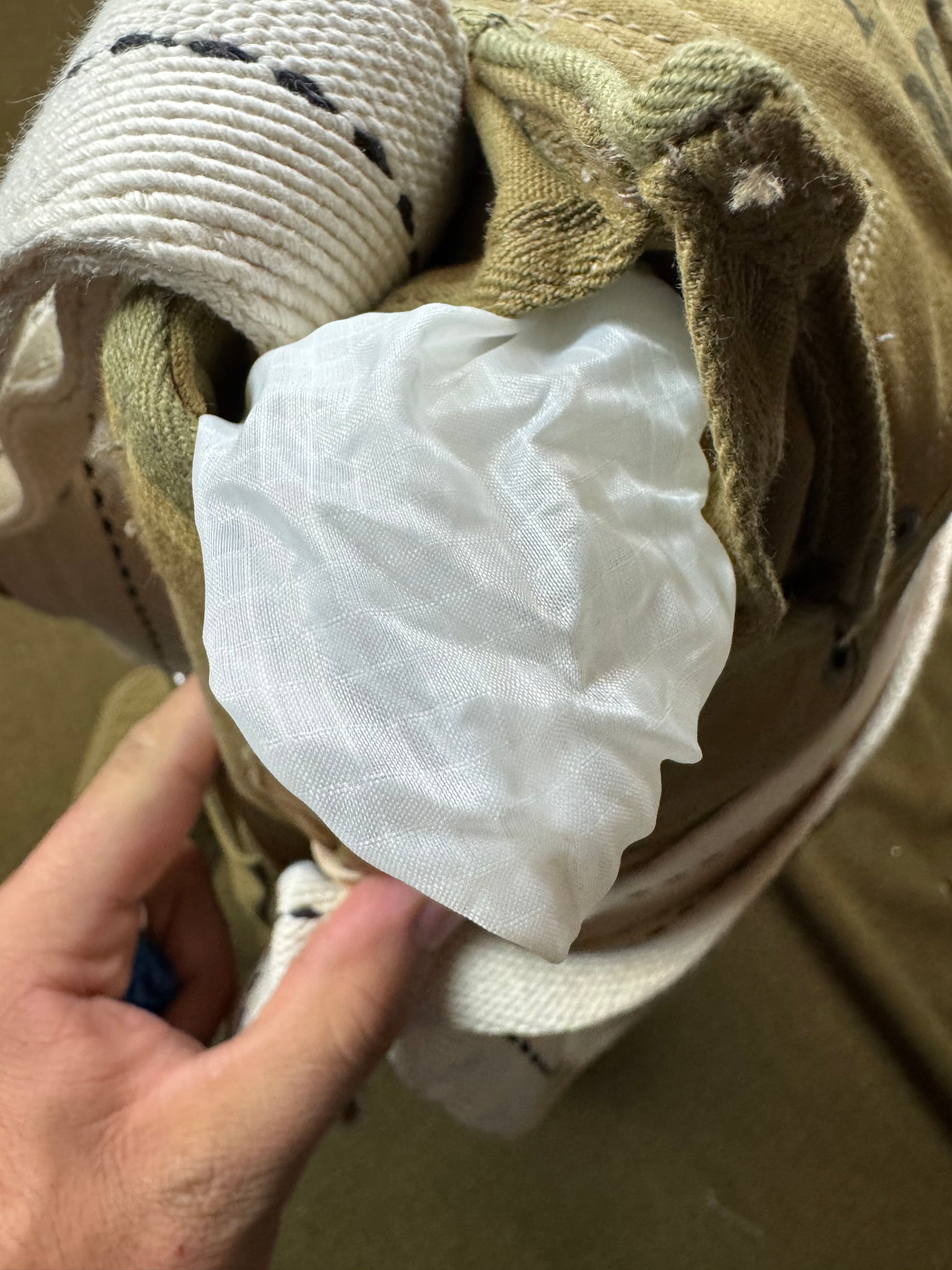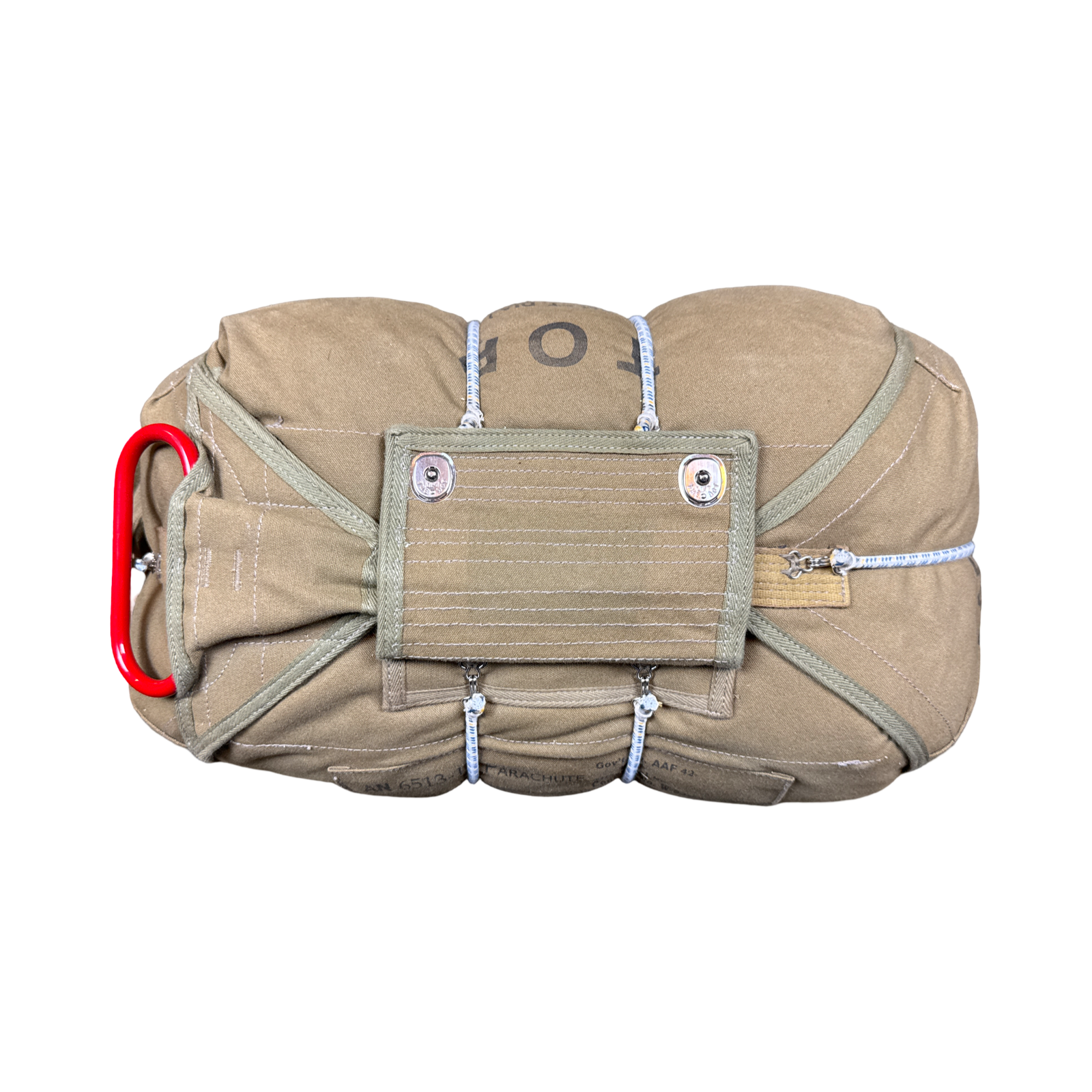 The hardware all looks to be original with the exception of the 5th model snap hook. The main pack and the reserve both have parachute canopies inside them. The canopy in the main pack is for sure a post war canopy as it has rip stop fabric (see photo). The canopy in the reserve pack is not rip stop fabric so it could be original but we cannot guarantee that. Additionally we do not know the condition of the lines on the main canopy or the reserve, they could be fully attached to the pack trays but they could also be loose or even cut. Unfortunately the only way to confirm the condition of the lines is to cut the pack ties and the rigger seal which we are not wanting to do for obvious reasons.