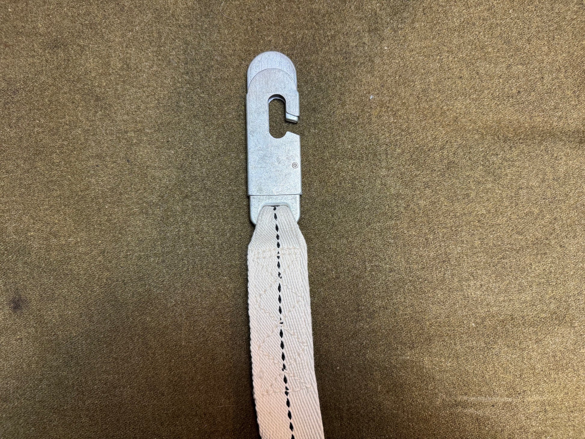 This is a white webbing harness dated June of 1943 and would have been the most common style of rig used in Operation husky. The same style of harness could have been seen in Normandy as well. The equipment V ring is "whip stitched" to the harness (this is a tell tail sign of an 82nd Airborne rig).
